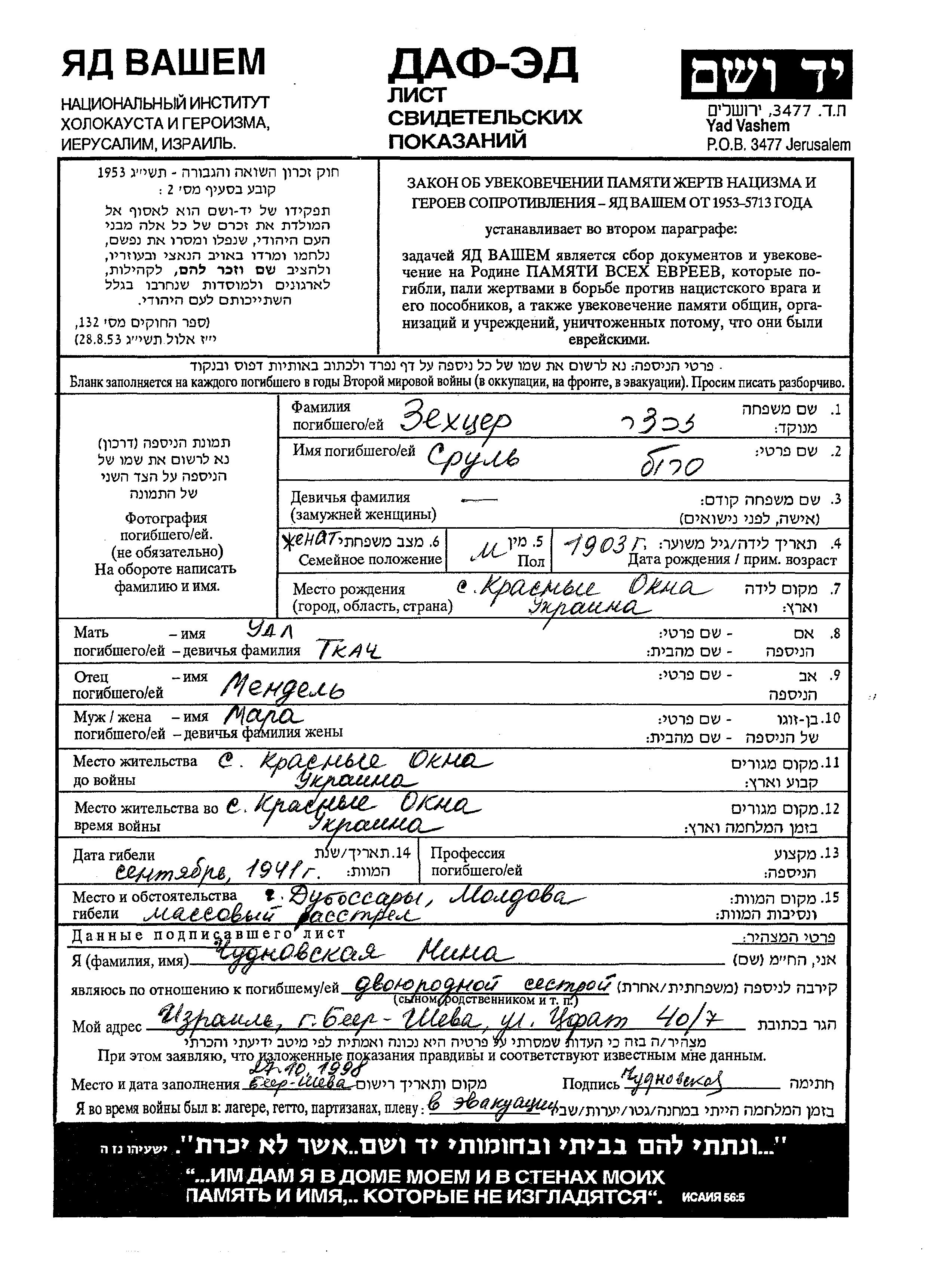 Зехцер Сруль 1903 Красные Окна, Украина (СССР) Лист свидетельских показаний