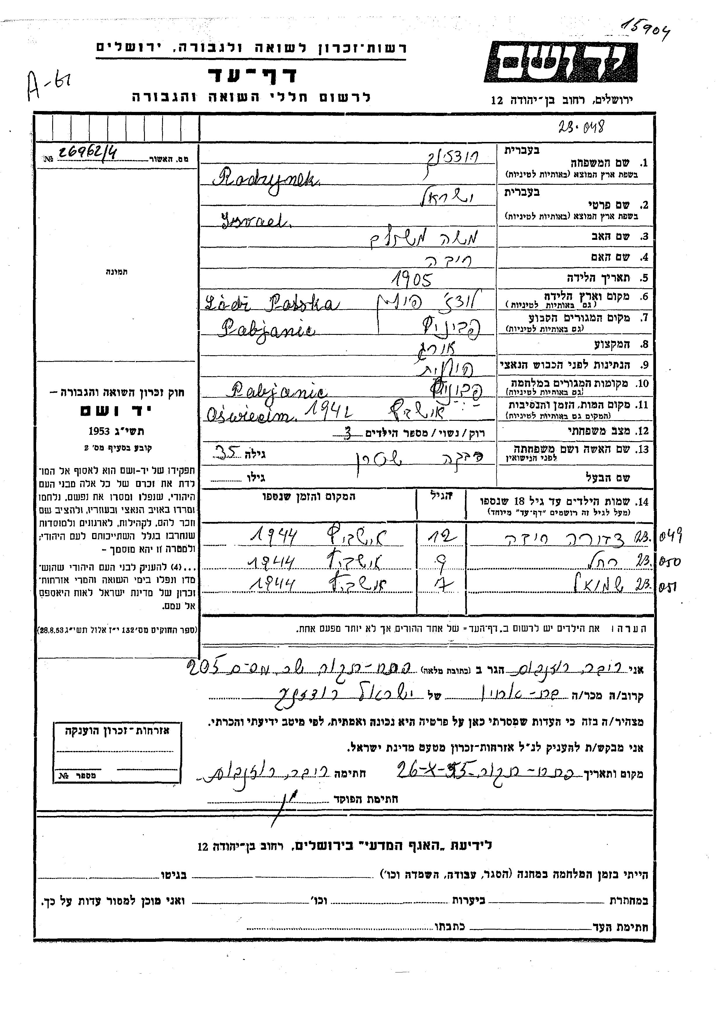 Родзинек Исраэль 1905 Пабьянице, Польша Лист свидетельских показаний