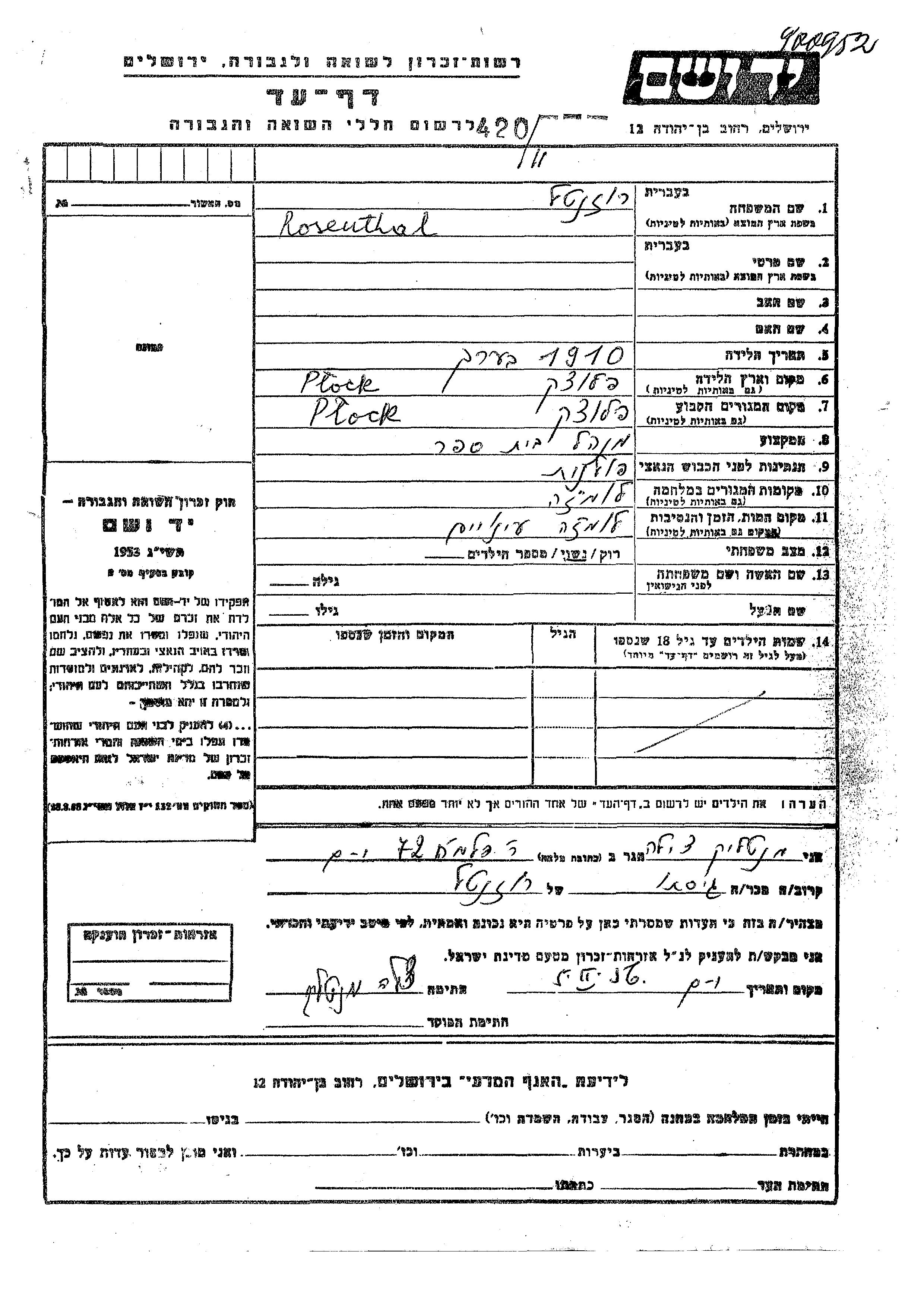 Розенталь Имя неизвестно 1910 Плоцк, Польша Лист свидетельских показаний