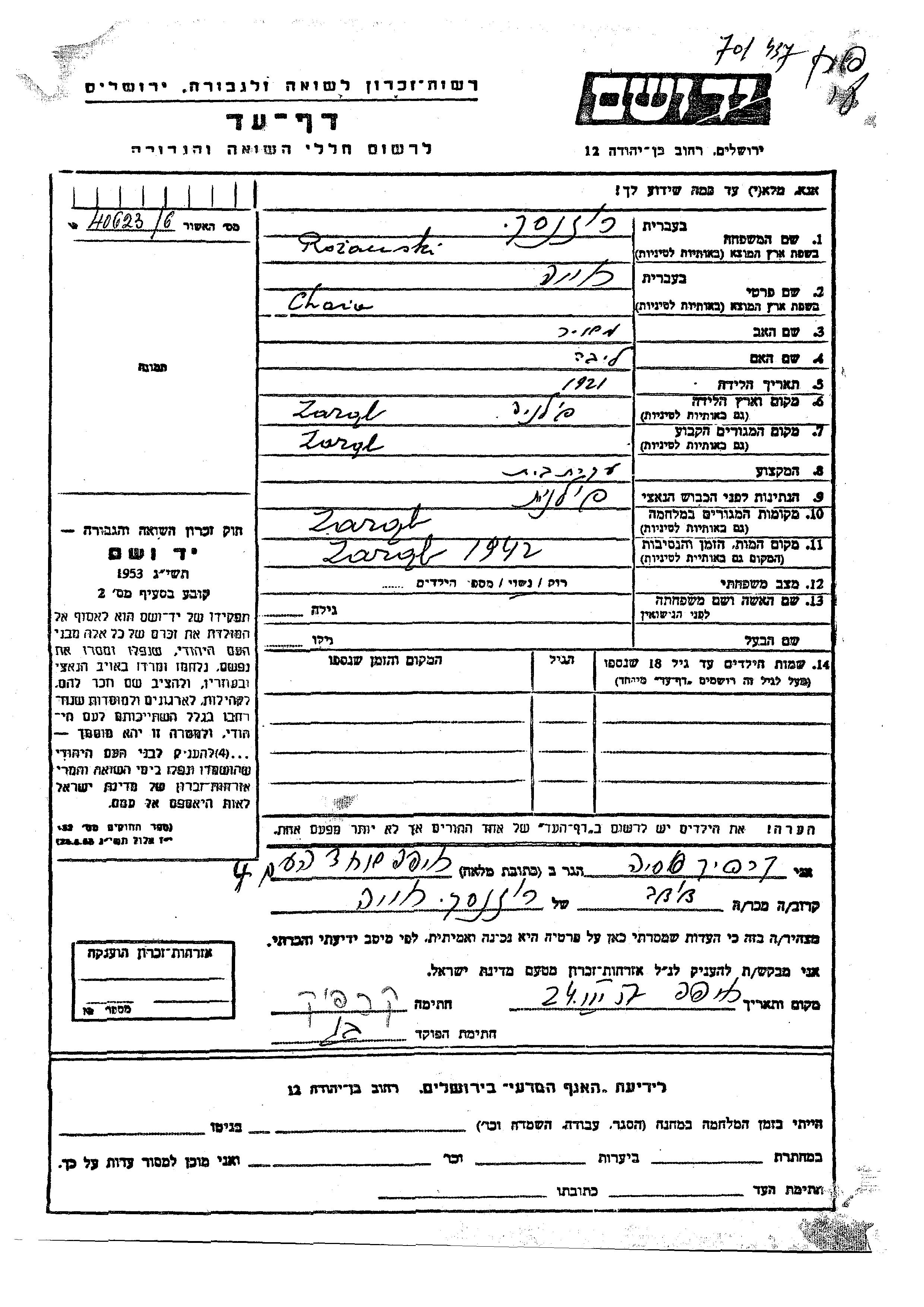 Хая Розански, место рождения: Жарки, Польша. Отец: Меир, mать:Либа. Домохозяйка. Женат / замужем. Место жительства до войны: Жарки, Польша. Место во время войны: Жарки, Польша.