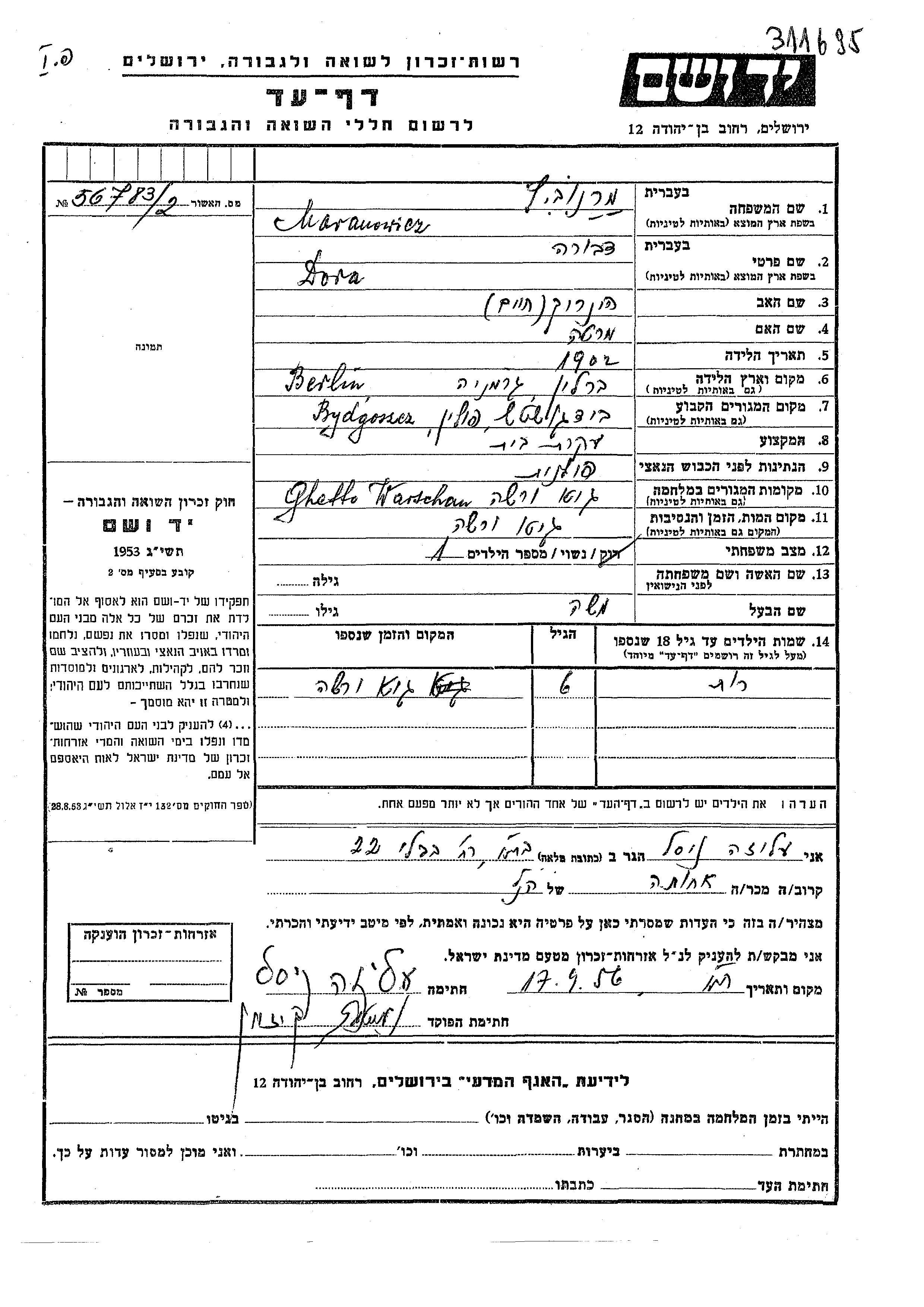 Дора Двора Маранович, место рождения: Берлин, Германия. Отец: Хейнрих Хаим, mать:Марта. Домохозяйка. Женат / замужем. Место жительства до войны: Быдгощ, Польша. Место во время войны: Варшава, Польша.