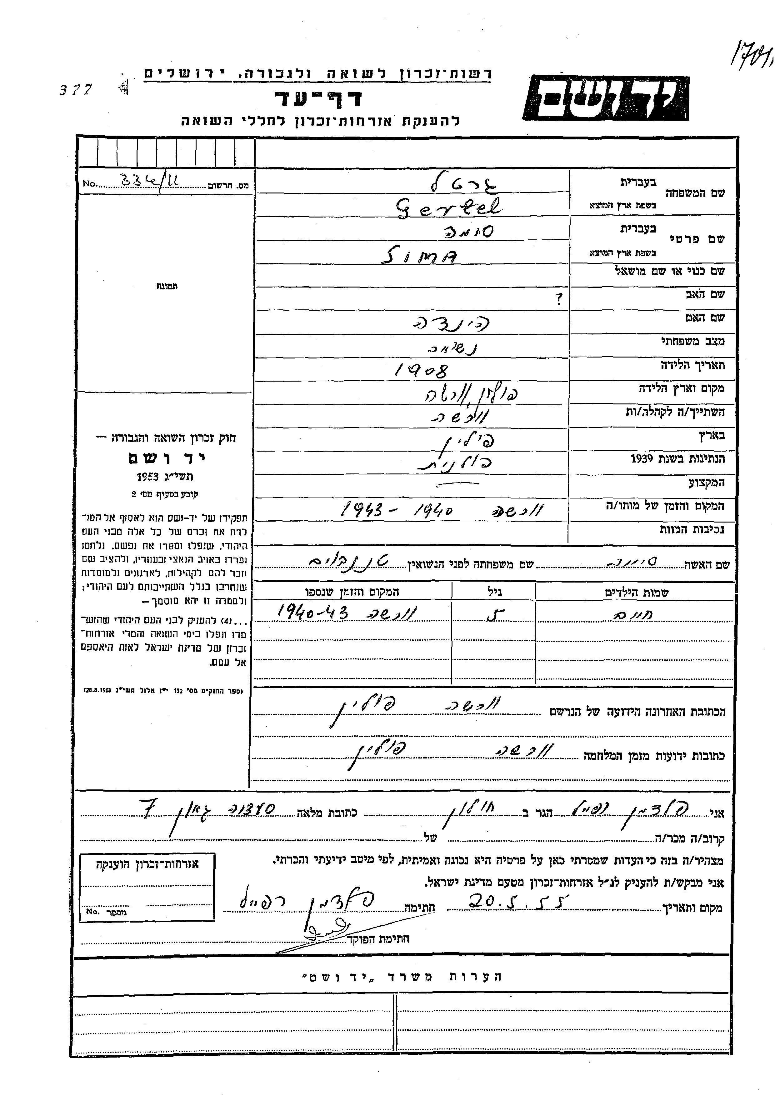 Сима Гертель, девичья фамилия Тененбойм, место рождения: Варшава, Польша.Mать:Хинда. Женат / замужем. Место жительства до войны: Варшава, Польша. Место во время войны: Варшава, Польша.