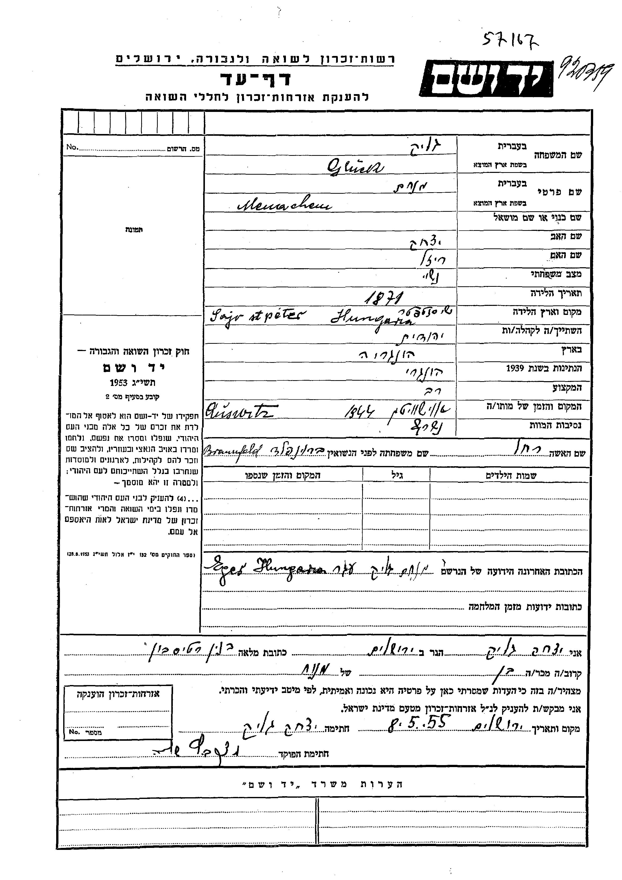 Менахем Глюк, место рождения: Венгрия. Отец: Ицхак, mать:Рейзел. Раввин. Женат / замужем.
