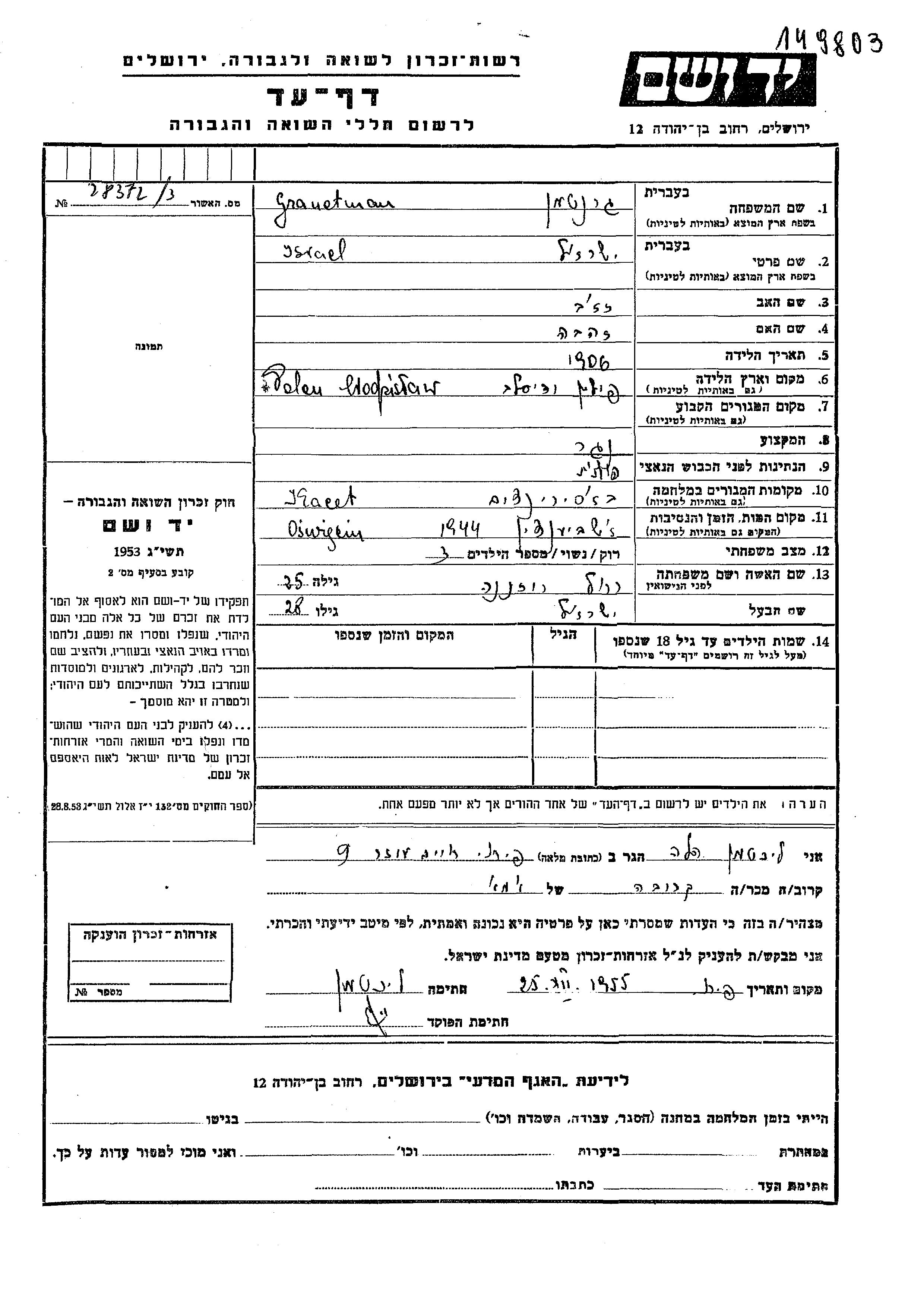 Гранетман Исраэль 1906 место не указано, Лист свидетельских показаний