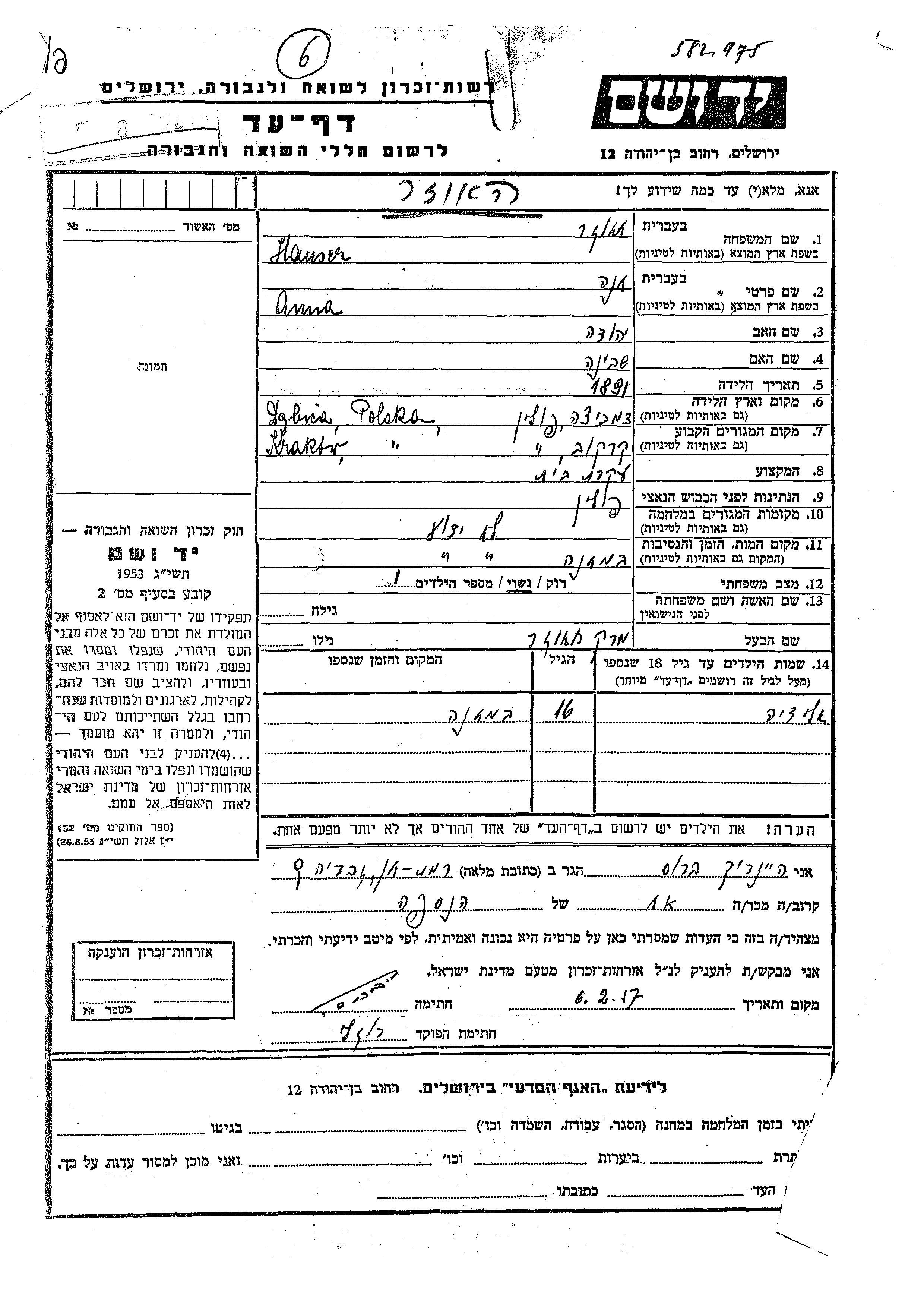 Анна Хана Хойзер, место рождения: Дембица, Польша. Отец: Иегуда, mать:Шабина. Домохозяйка. Женат / замужем. Место жительства до войны: Краков, Польша.