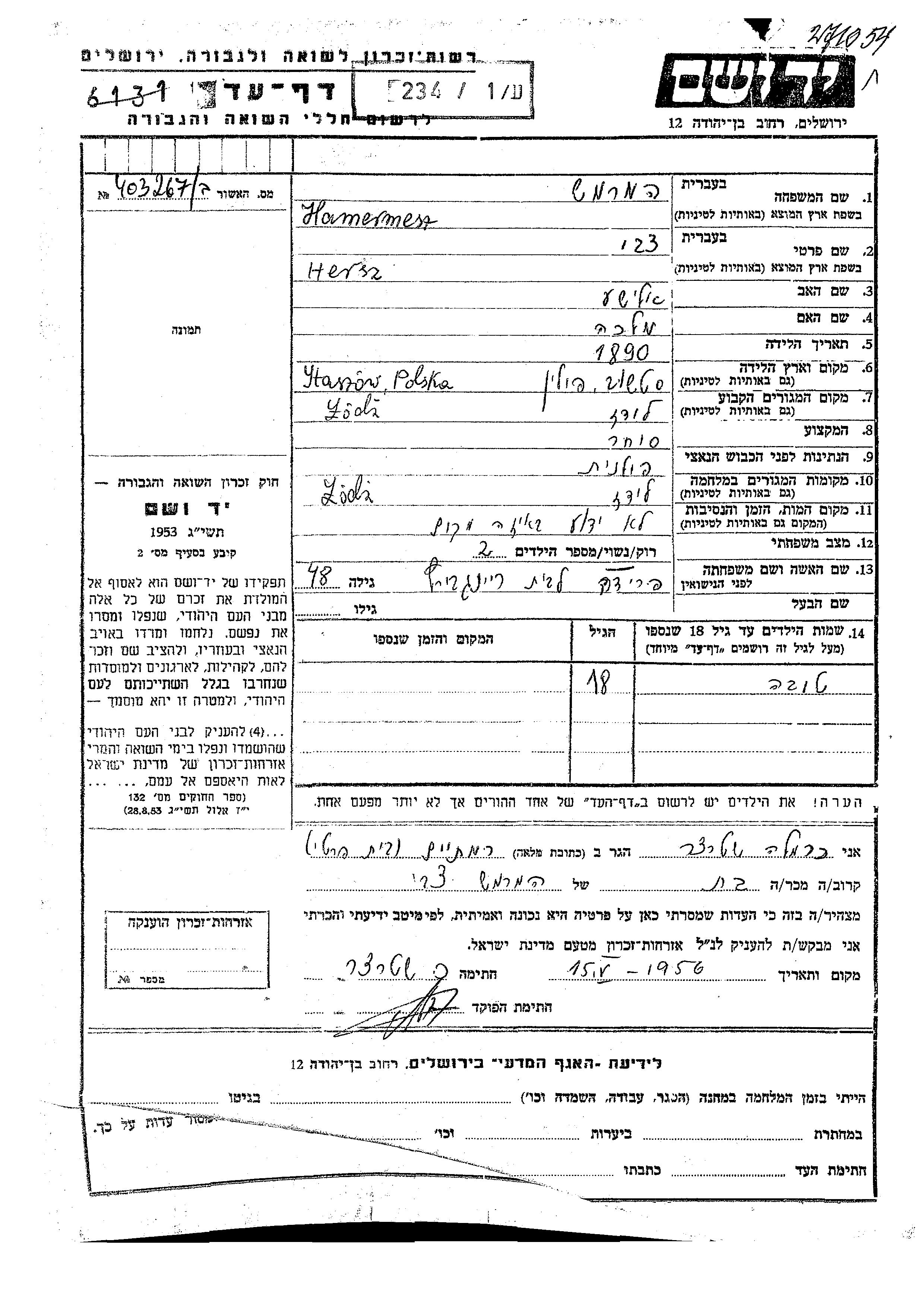 Герш Цви Хамермеш, место рождения: Сташув, Польша. Отец: Элиша, mать:Малка. Торговец / торговка. Женат / замужем. Место жительства до войны: Лодзь, Польша. Место во время войны: Лодзь, Польша.