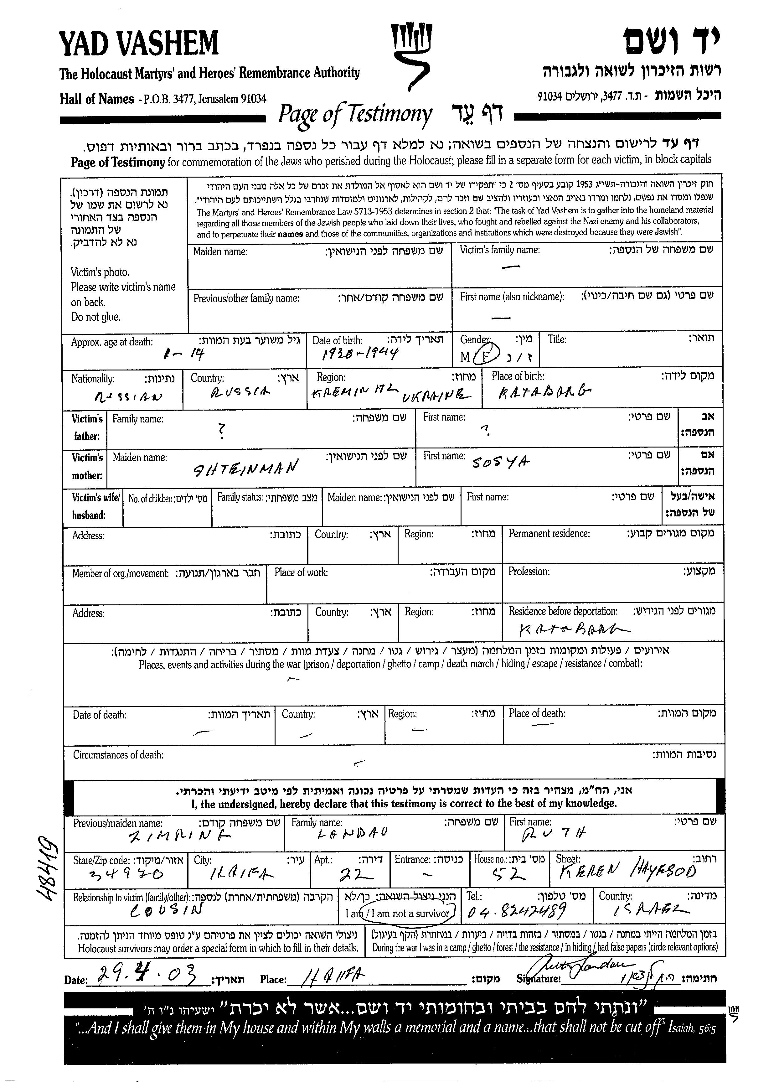 Яд Вашем - Листы свидетельских показаний Мемориального фонда
