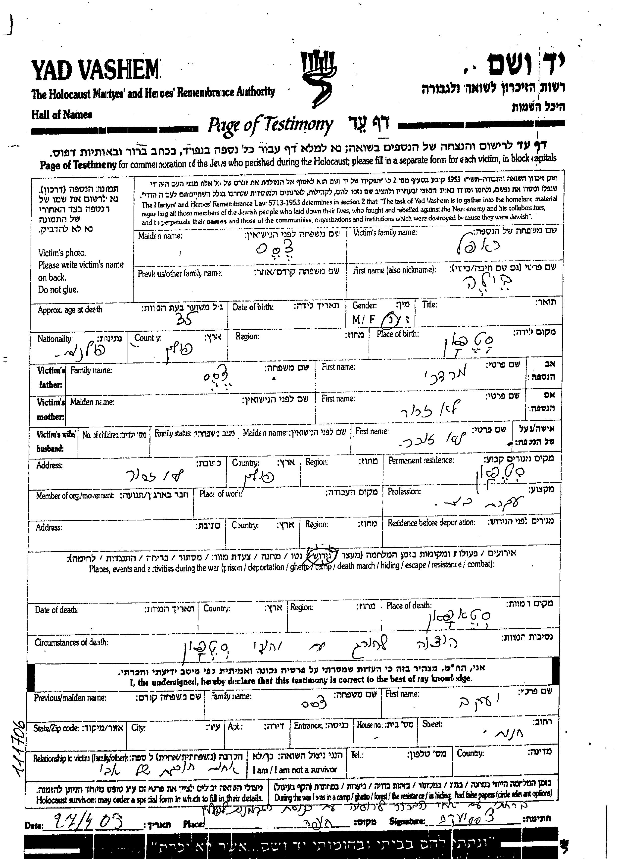 Яд Вашем - Листы свидетельских показаний Мемориального фонда