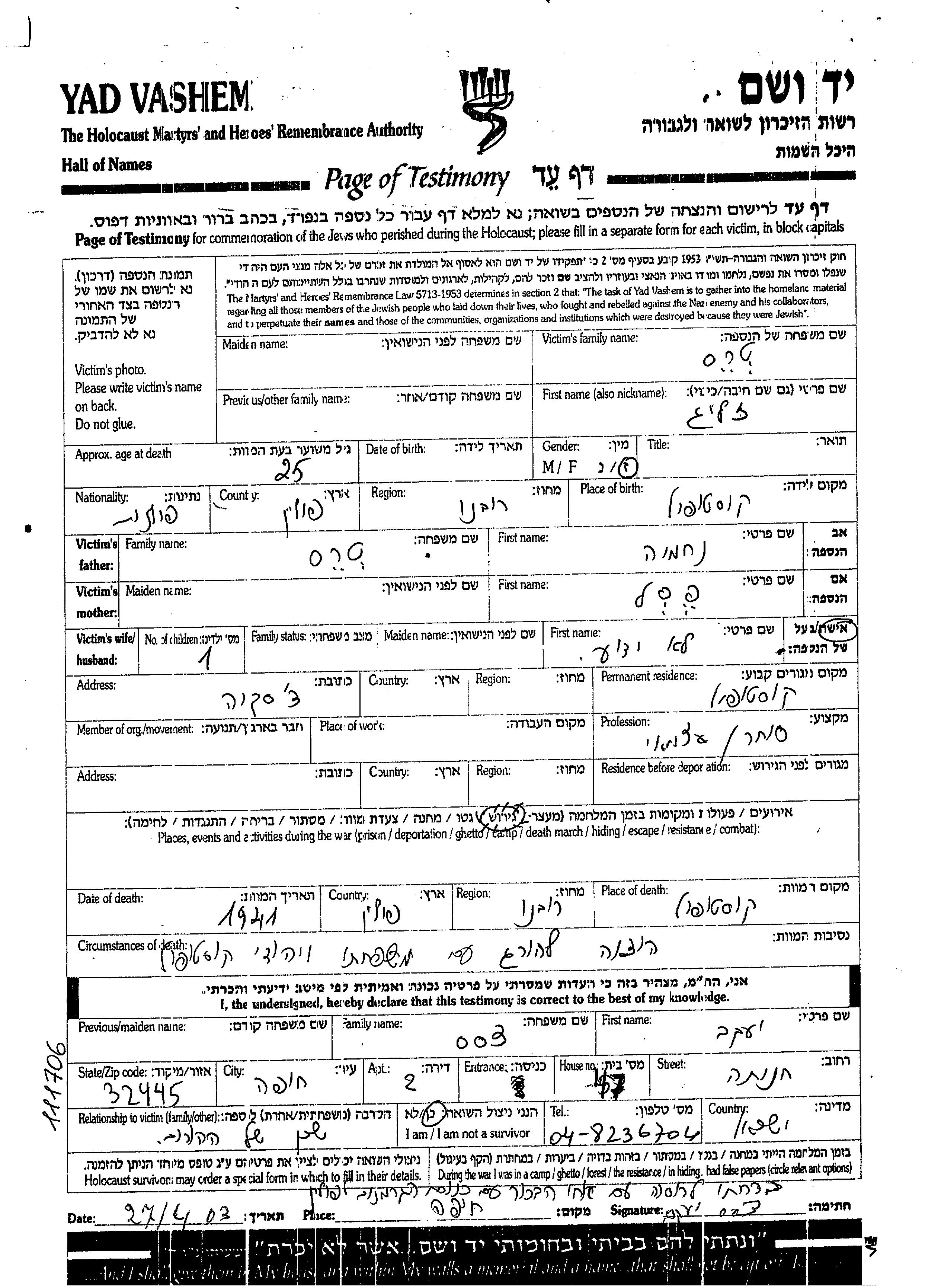 Яд Вашем - Листы свидетельских показаний Мемориального фонда