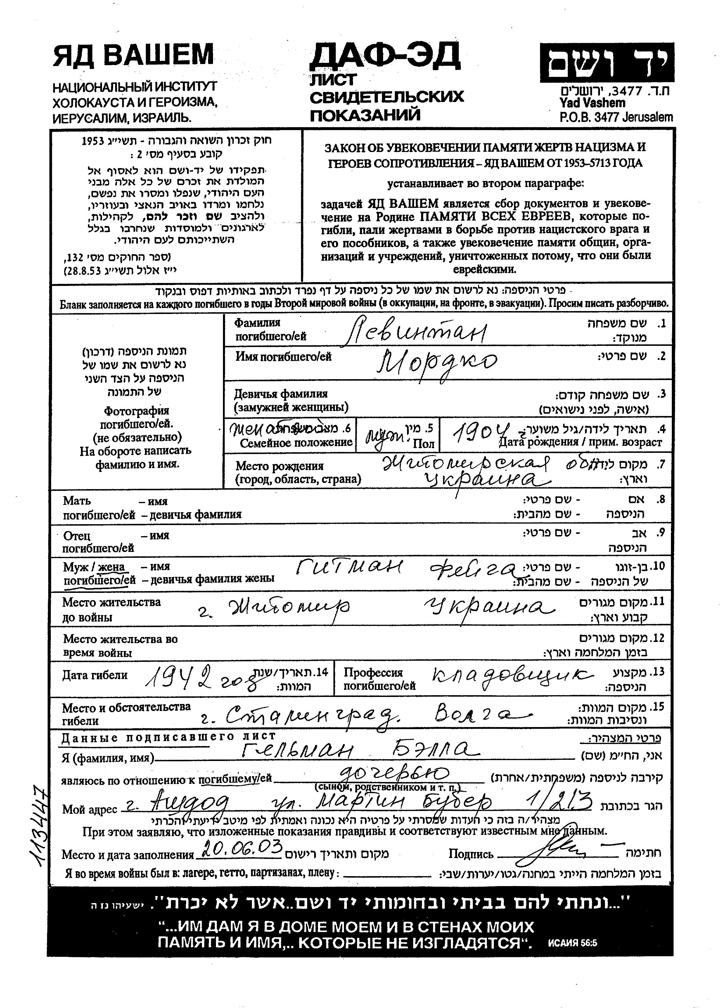 Левинтан Мордко 1904 Житомир, Украина (СССР) Лист свидетельских показаний