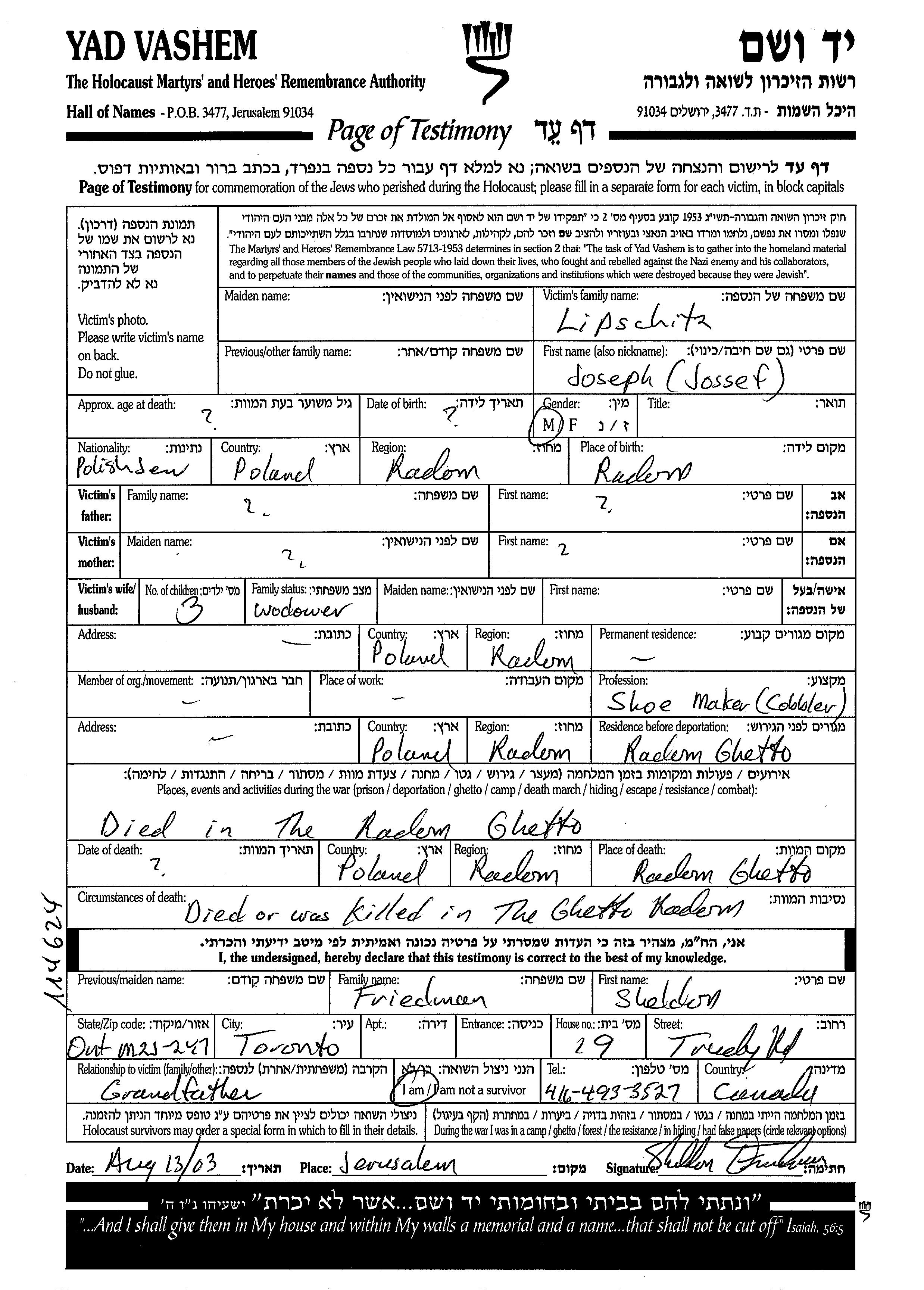 Йосеф Липшиц, место рождения: Радом, Польша. Производитель обуви. Вдовец. Место жительства до войны: Радом, Польша. Место во время войны: Радом, Польша.