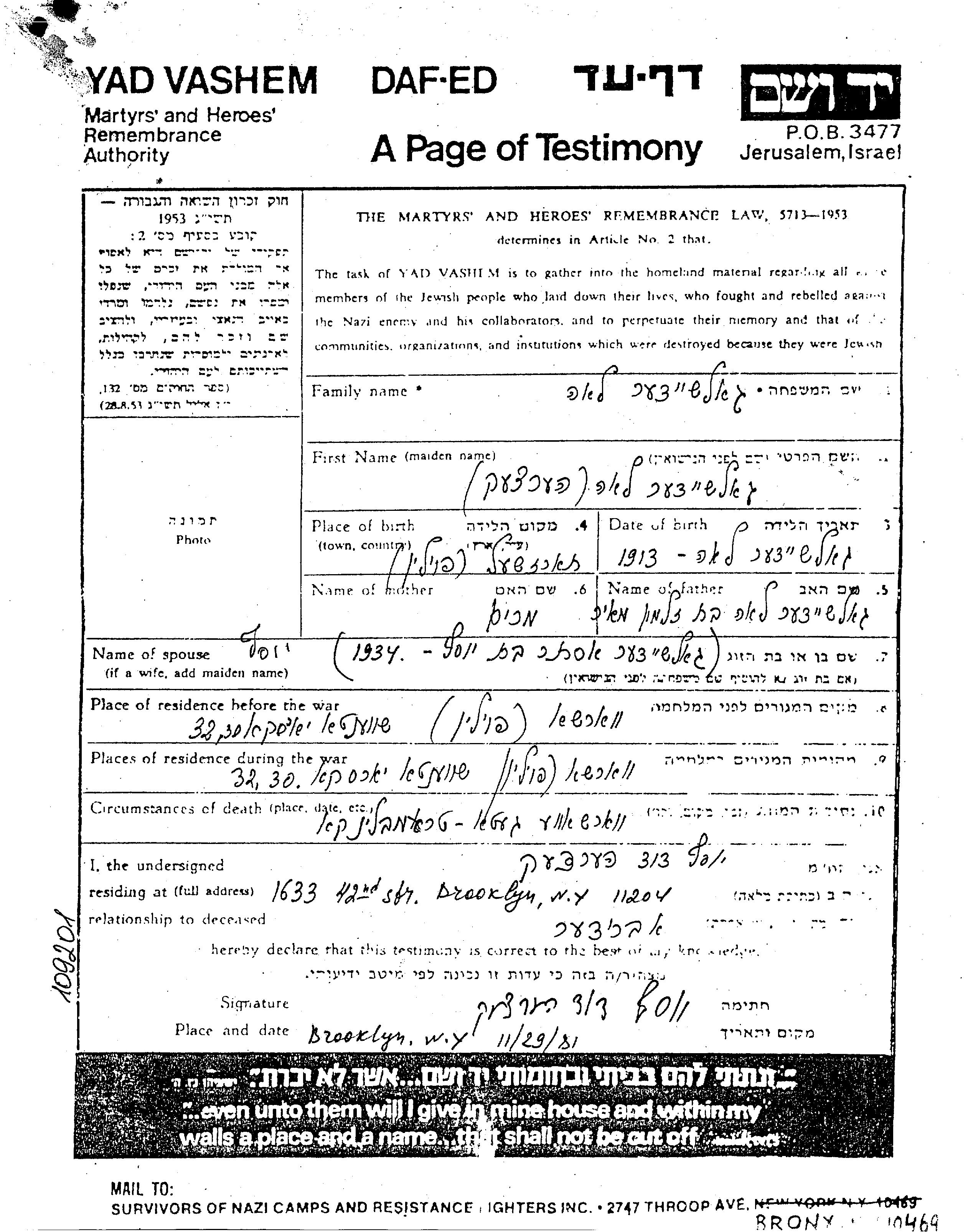 Голешицер Лея 1913 Варшава, Польша Лист свидетельских показаний