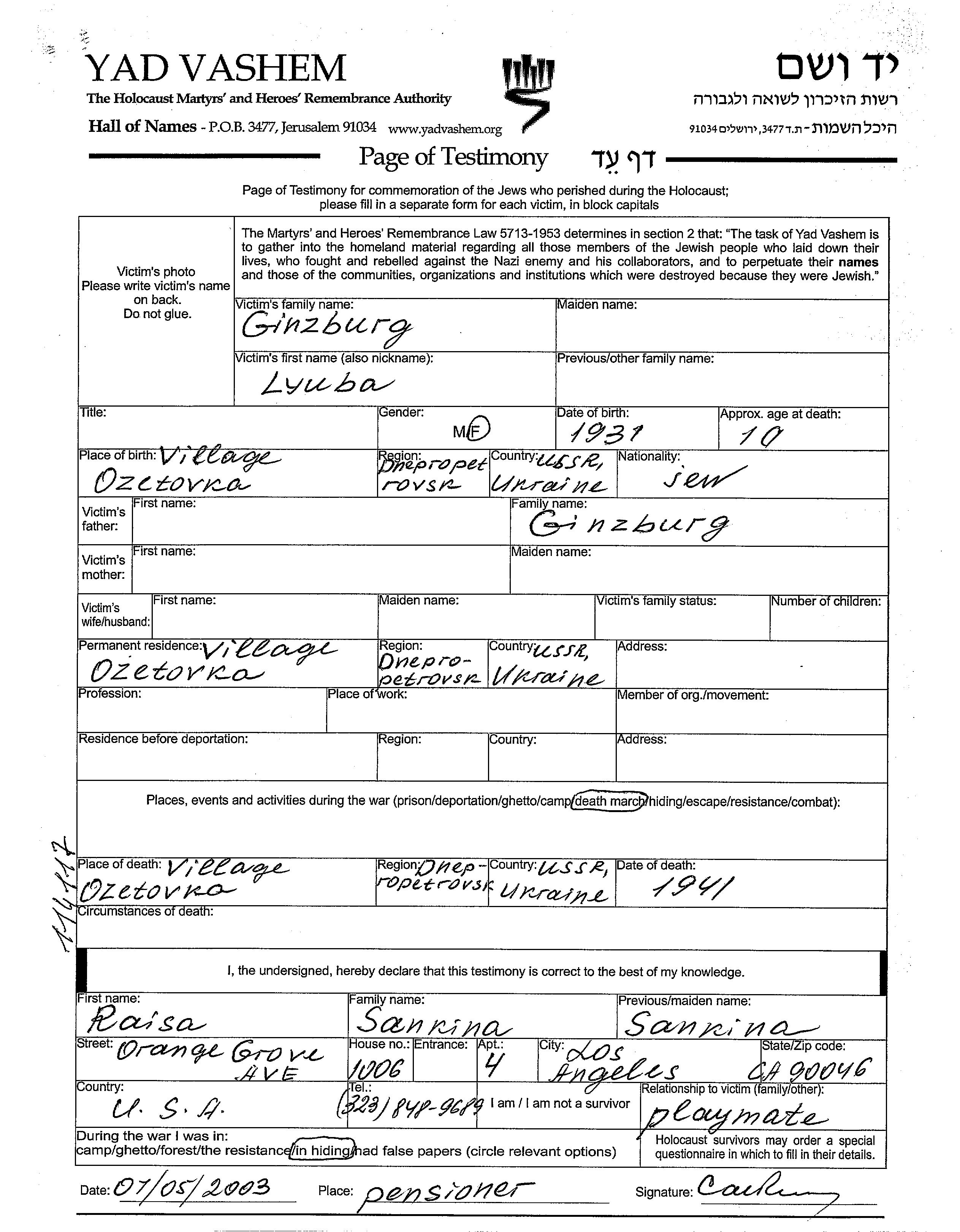 Гинзбург Люба 1931 Озетовка, Украина (СССР) Лист свидетельских показаний