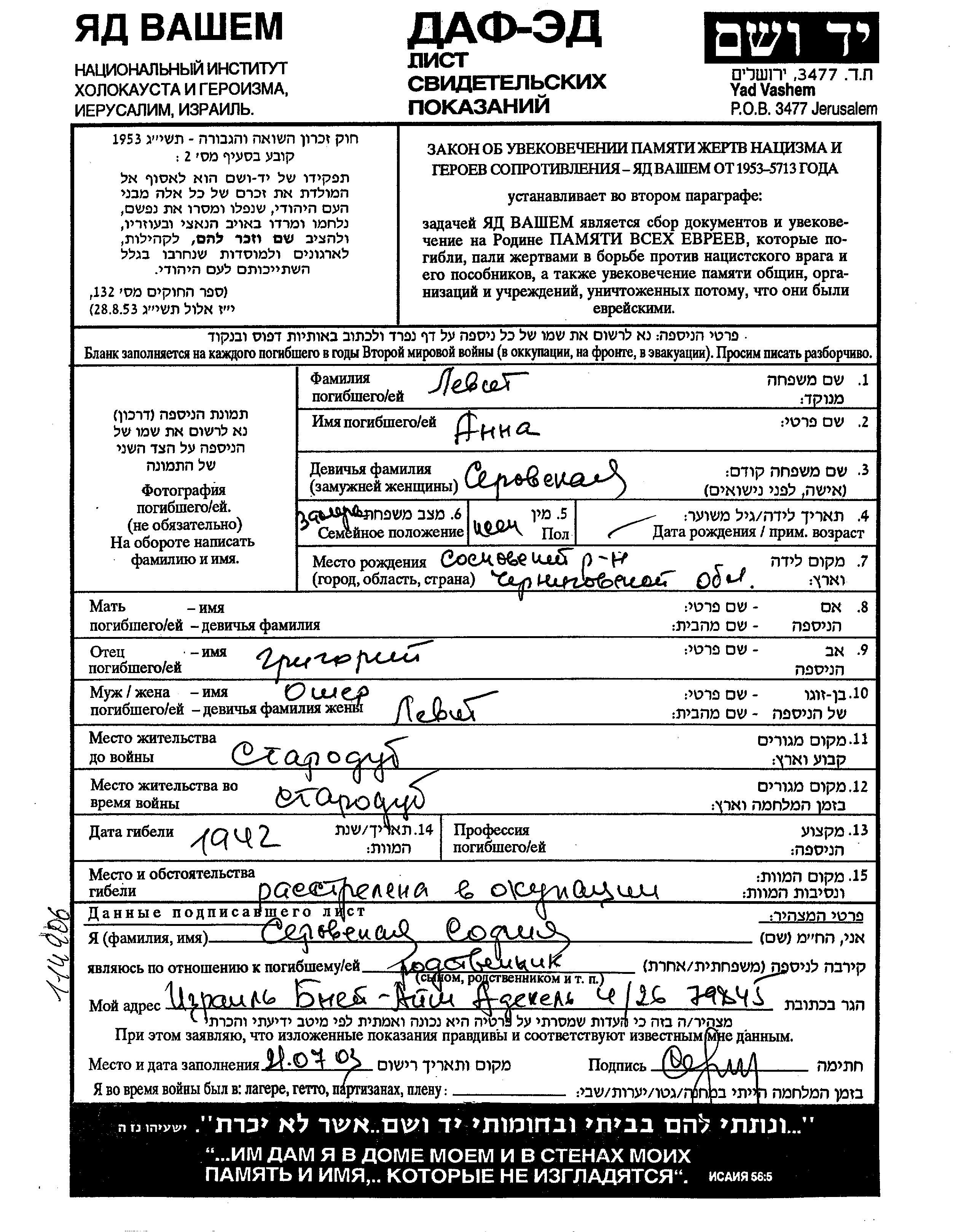Левит Анна Стародуб, Россия (СССР) Лист свидетельских показаний