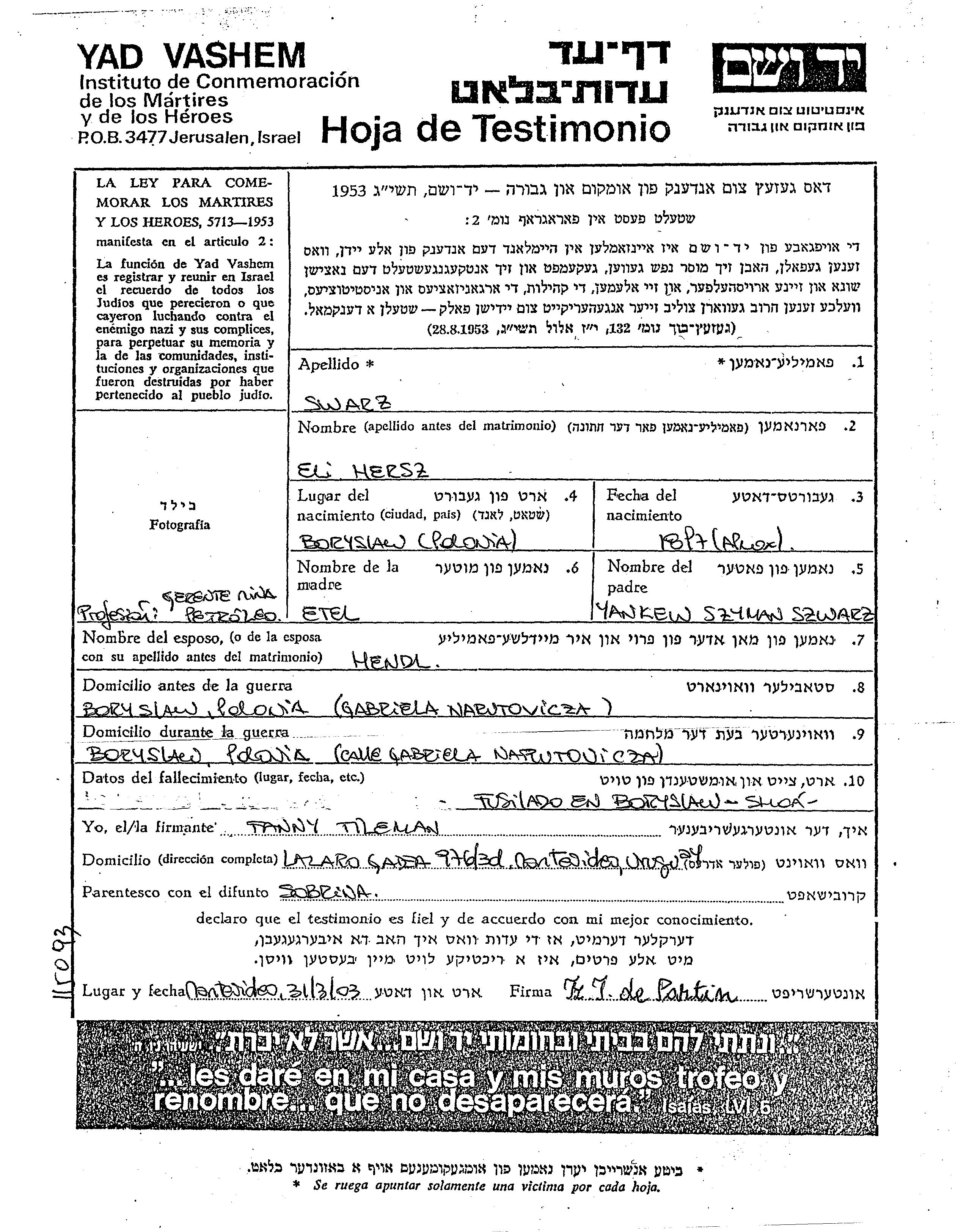 Эли Герш Шварц, место рождения: Борислав, Польша. Отец: Янкев Шиман, mать:Этель. Администратор. Женат / замужем. Место жительства до войны: Борислав, Польша. Место во время войны: Борислав, Польша.