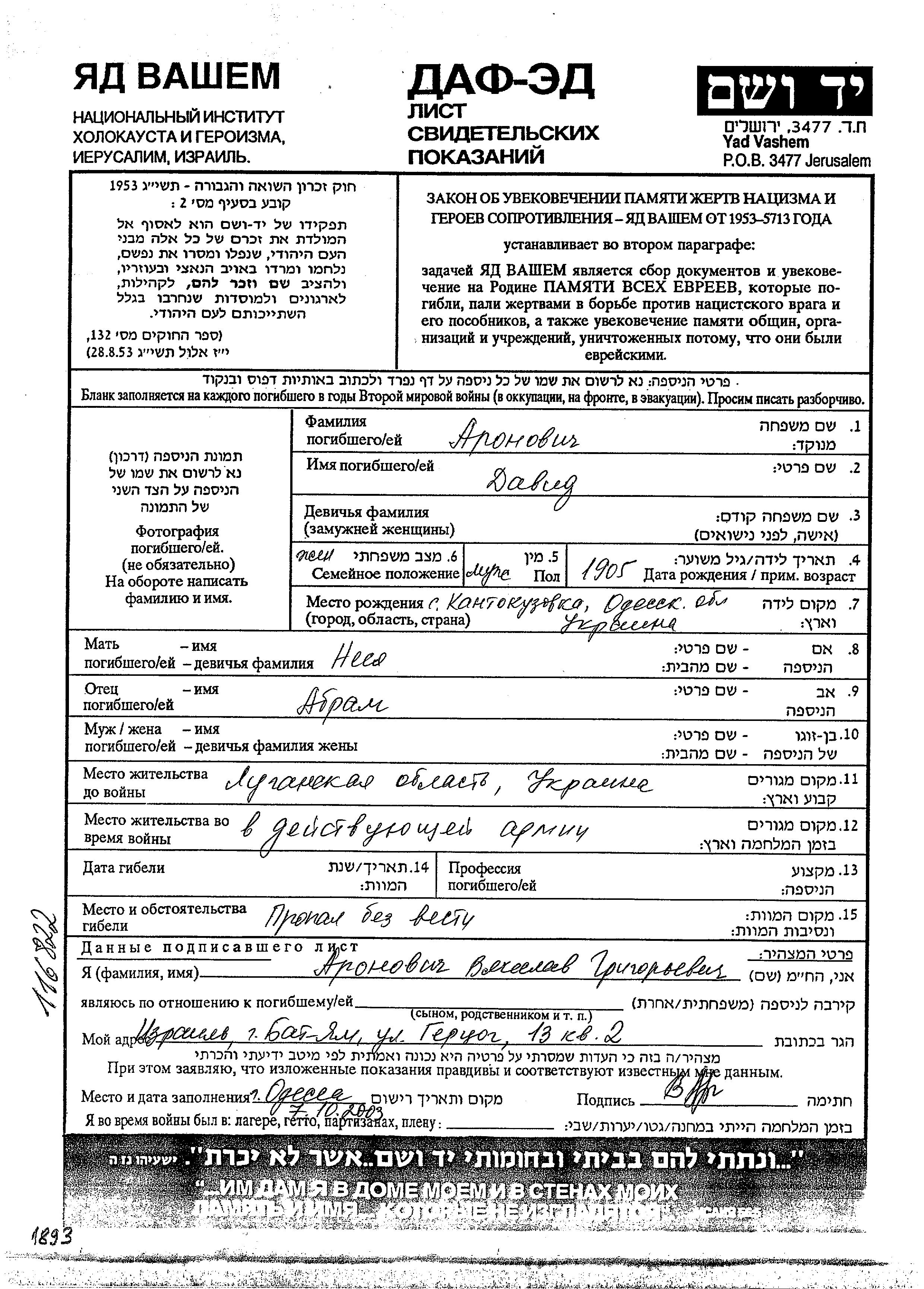 Аронович Давид 1905 Украина (СССР) Лист свидетельских показаний