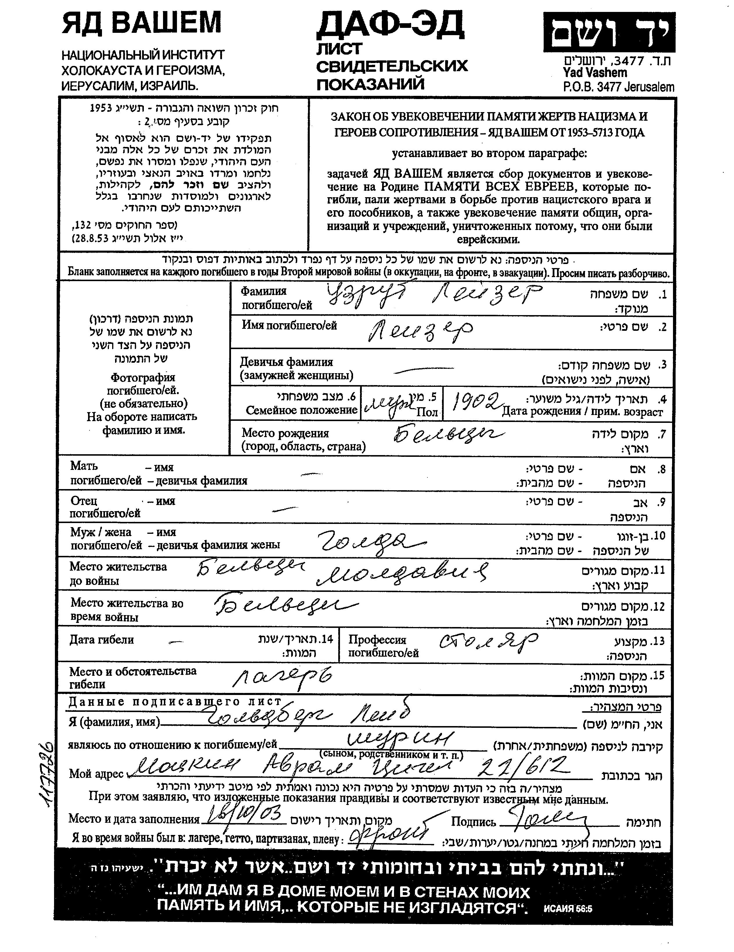 Яд Вашем - Листы свидетельских показаний Мемориального фонда