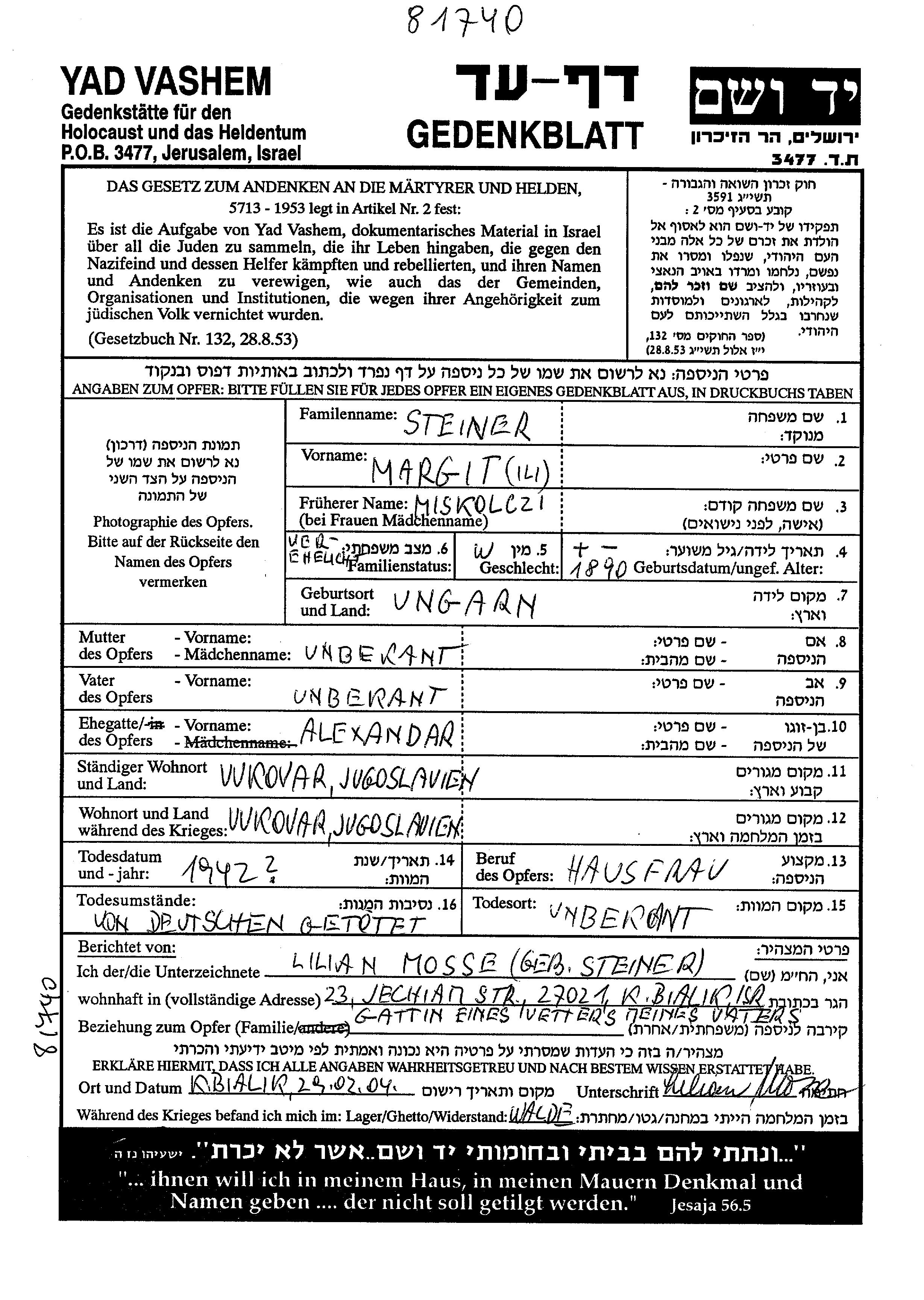 Или Маргит Штайнер, девичья фамилия Мискольчи, место рождения: Венгрия. Домохозяйка. Женат / замужем. Место жительства до войны: Вуковар, Югославия. Место во время войны: Вуковар, Югославия.