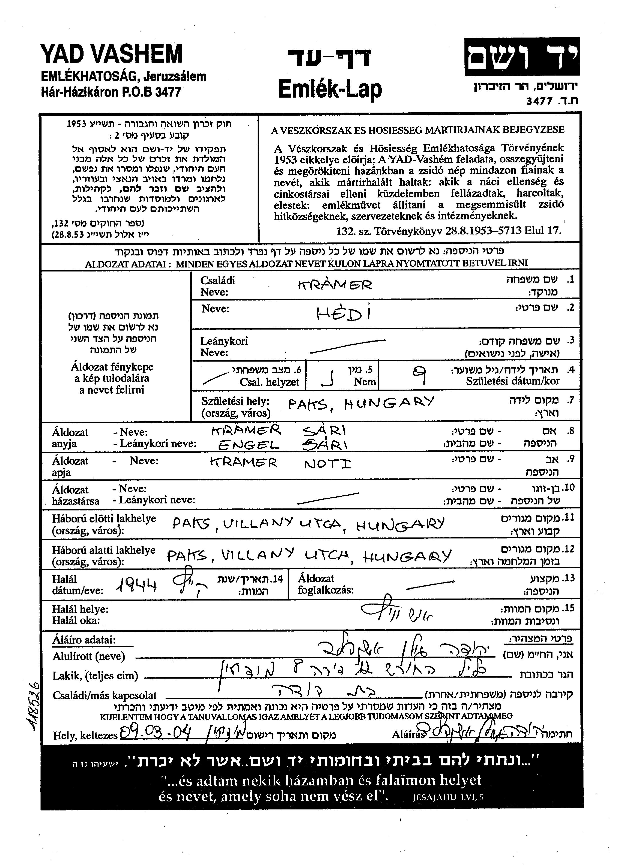 Хеди Крамер, место рождения: Пакш, Венгрия. Отец: Натан, mать:Сари, девичья фамилия Энгель. Место жительства до войны: Пакш, Венгрия. Место во время войны: Пакш, Венгрия.
