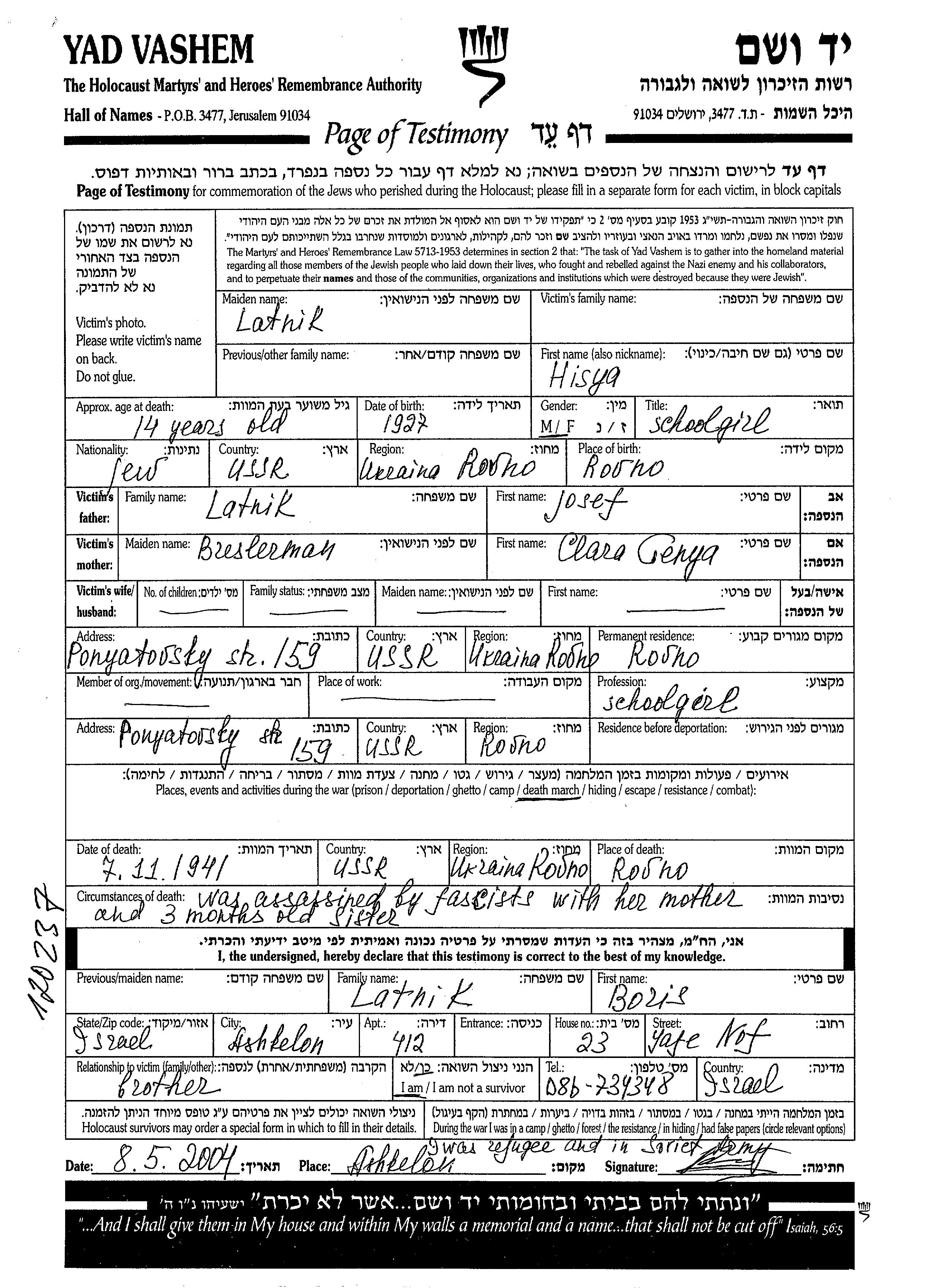 Яд Вашем - Листы свидетельских показаний Мемориального фонда