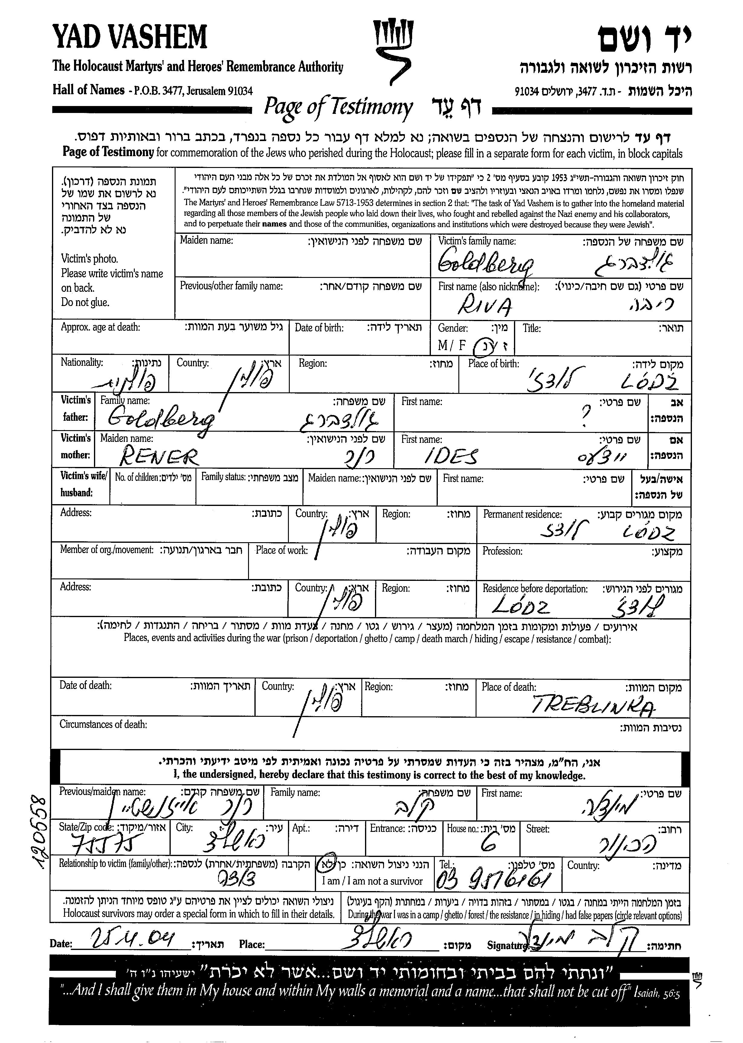 Рива Гольдберг, место рождения: Лодзь, Польша.Mать:Идес, девичья фамилия Ренер. Место жительства до войны: Лодзь, Польша. Место во время войны: Лодзь, Польша.
