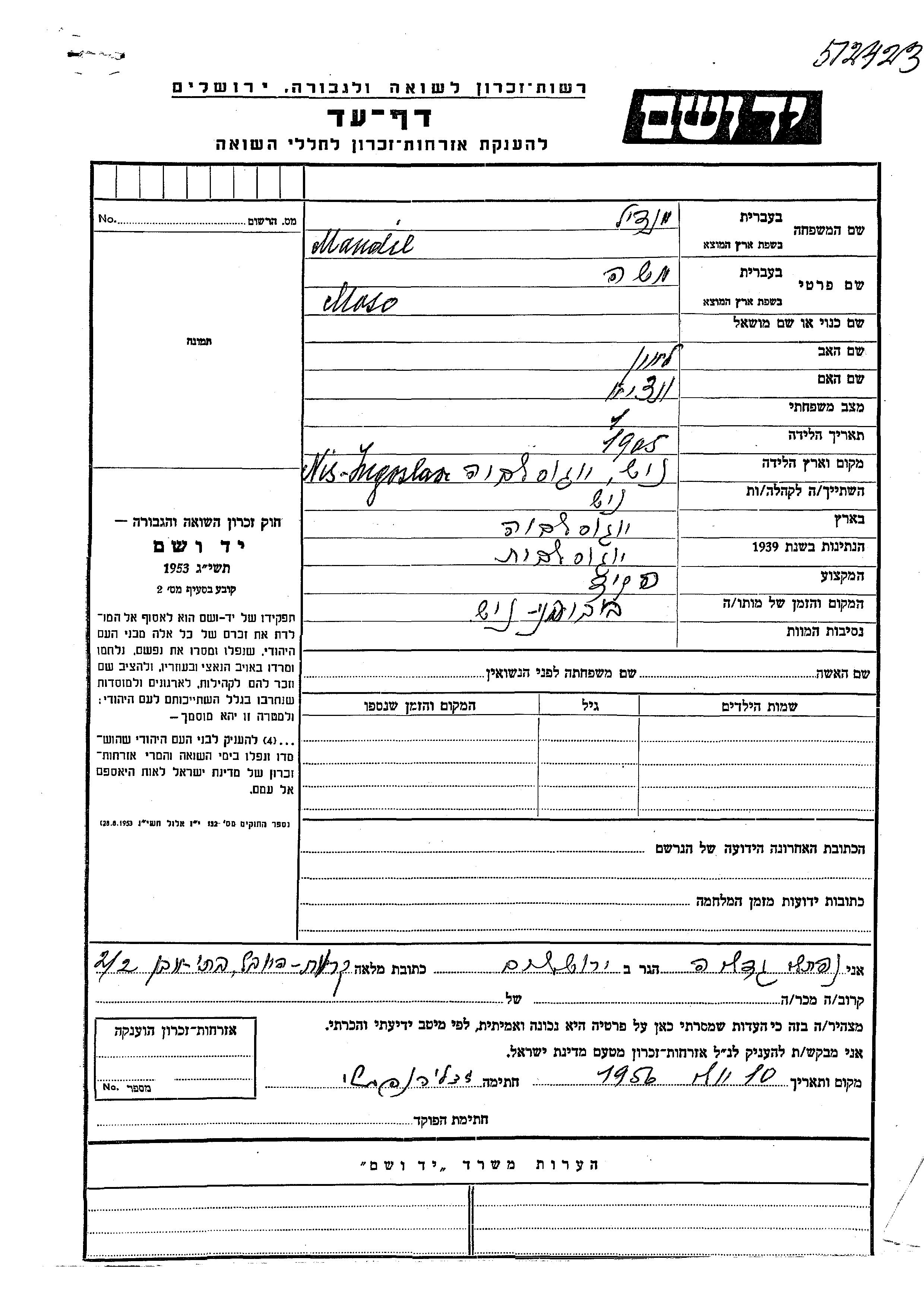 Мендиль Моше 1905 Ниш, Югославия Лист свидетельских показаний