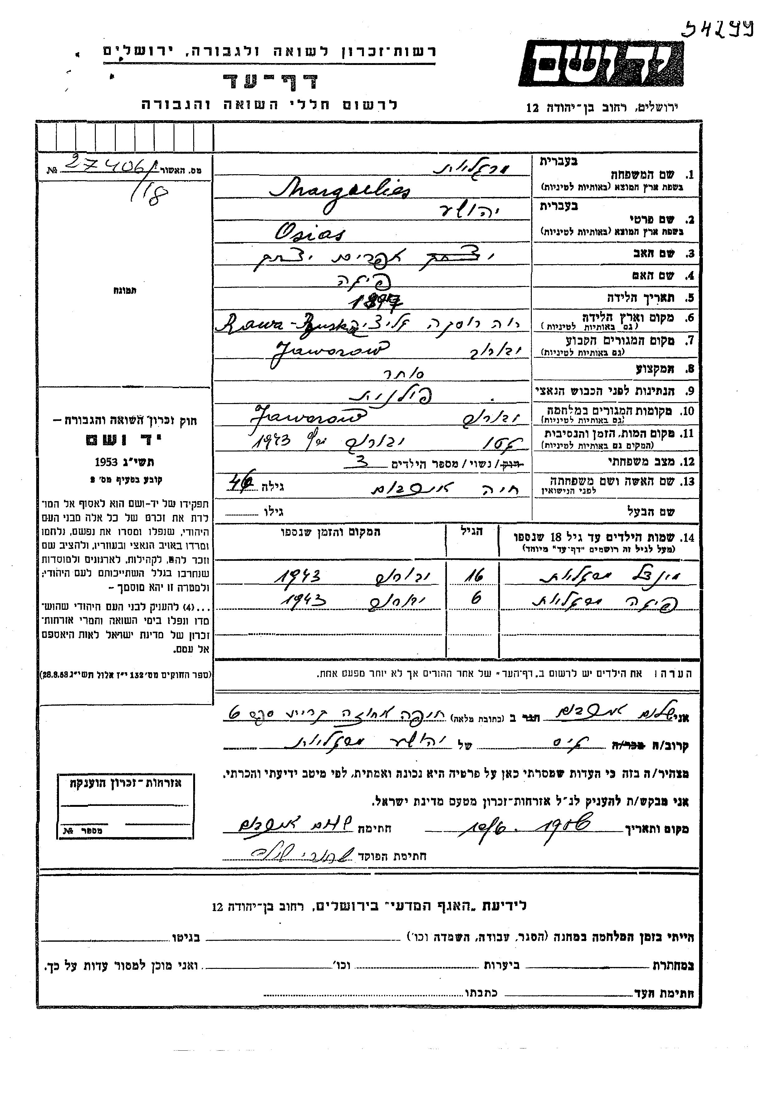 Иегошуа Озиас Маргулес, место рождения: Рава-Русская, Польша. Отец: Эфраим Ицхак, mать:Фейга. Торговец / торговка. Женат / замужем. Место жительства до войны: Яворов, Польша. Место во время войны: Яворов, Польша.