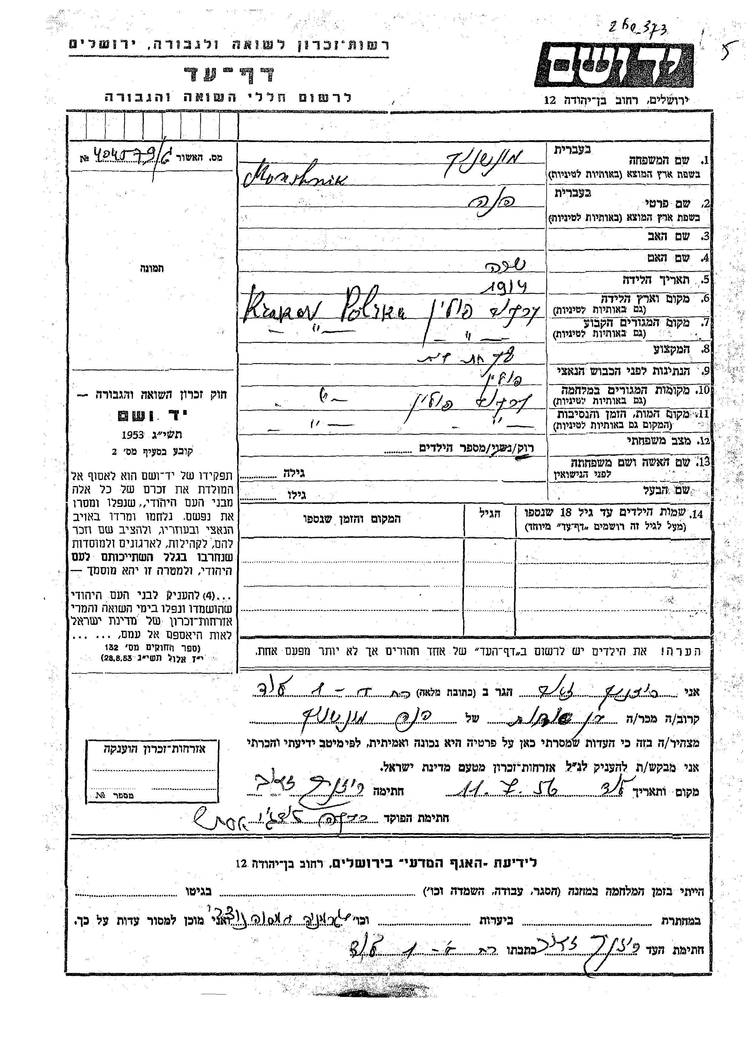 Хена Моншник, место рождения: Краков, Польша.Mать:Сара. Домохозяйка. Холост / не замужем. Место жительства до войны: Краков, Польша. Место во время войны: Краков, Польша.