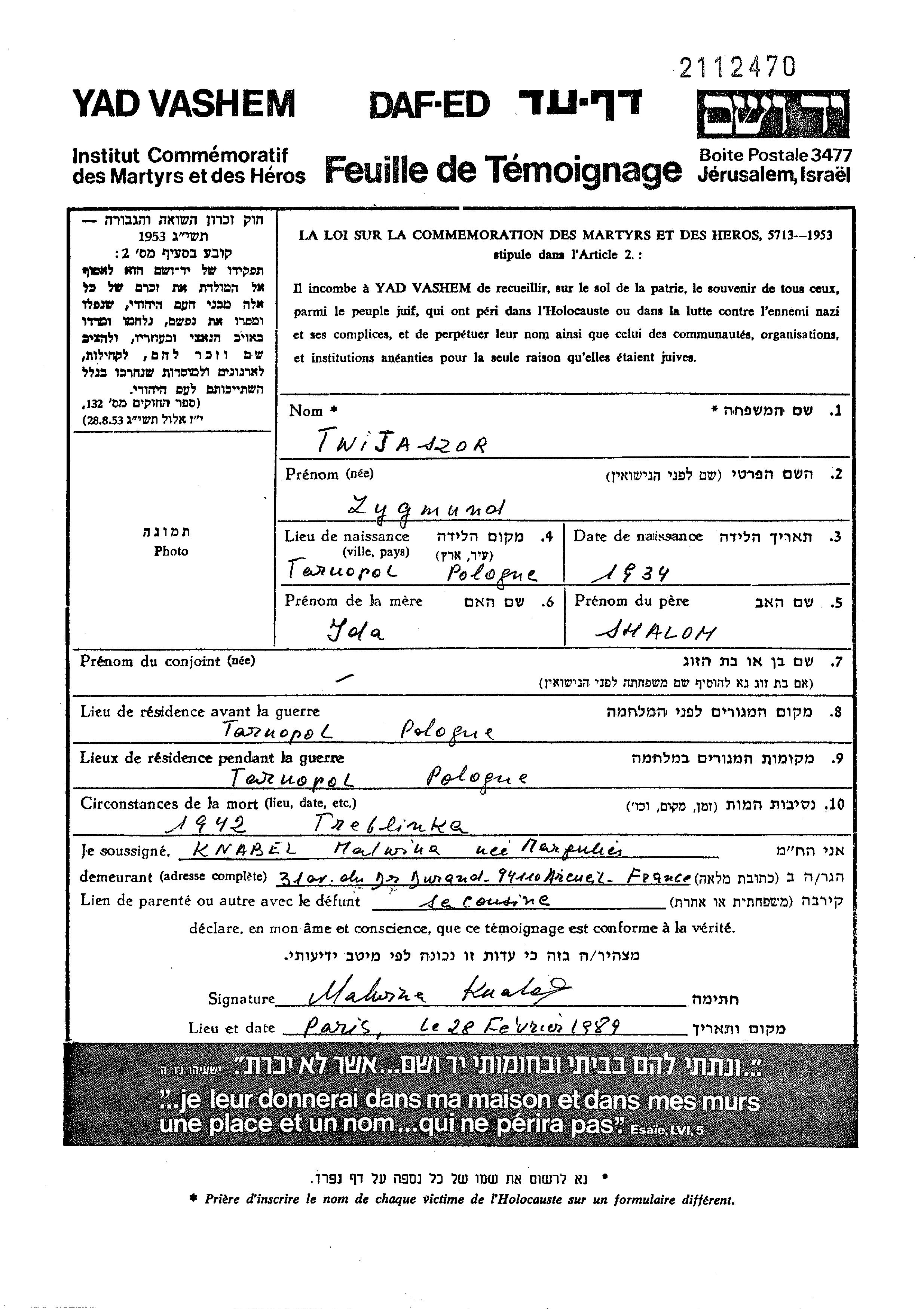 Твияшор Зигмунд 1934 Тарнополь, Польша Лист свидетельских показаний