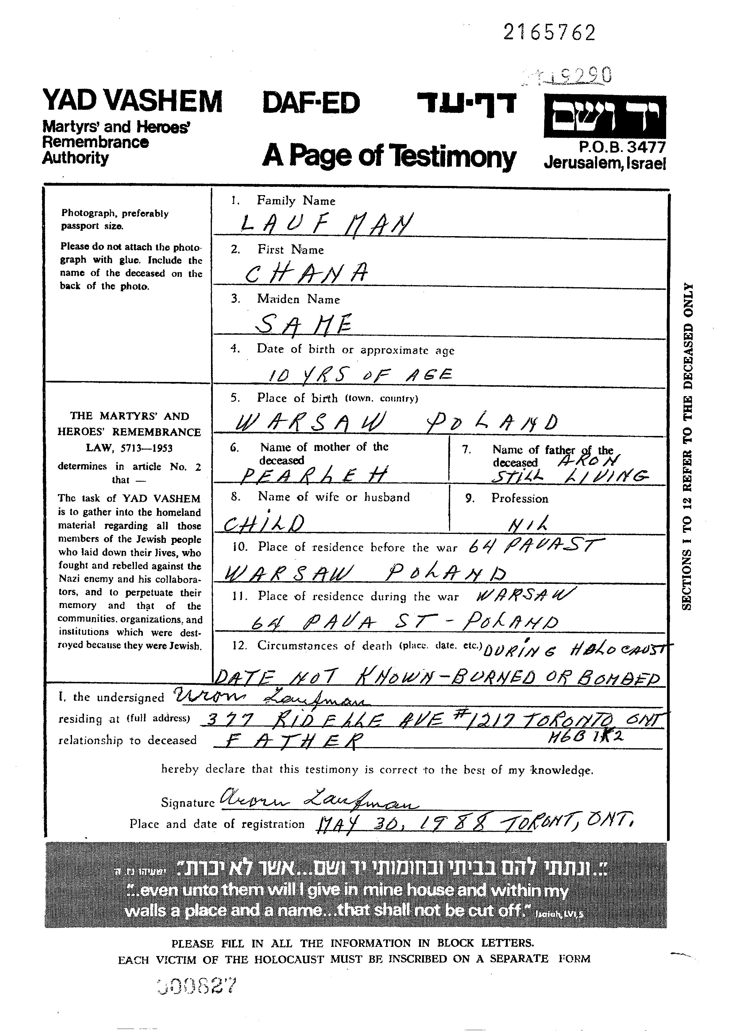 Хана Лауфман, место рождения: Варшава, Польша. Отец: Арон, mать:Перл. Ребенок. Место жительства до войны: Варшава, Польша. Место во время войны: Варшава, Польша.
