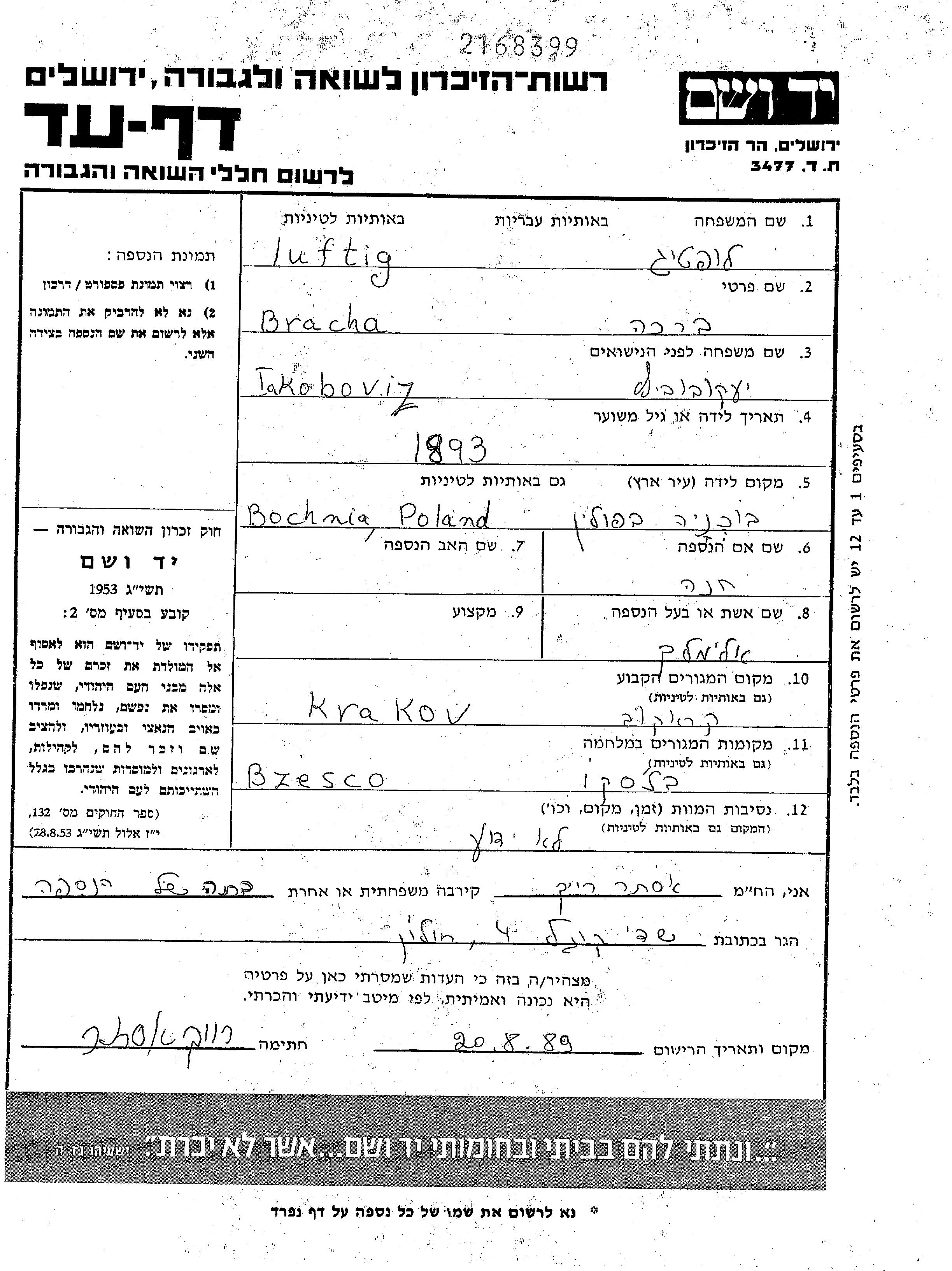 Браха Люфтиг, девичья фамилия Якубовиц Jakoboviz, место рождения: Бохня, Польша.Mать:Хана. Место жительства до войны: Краков, Польша. Место во время войны: Бжеско, Польша.