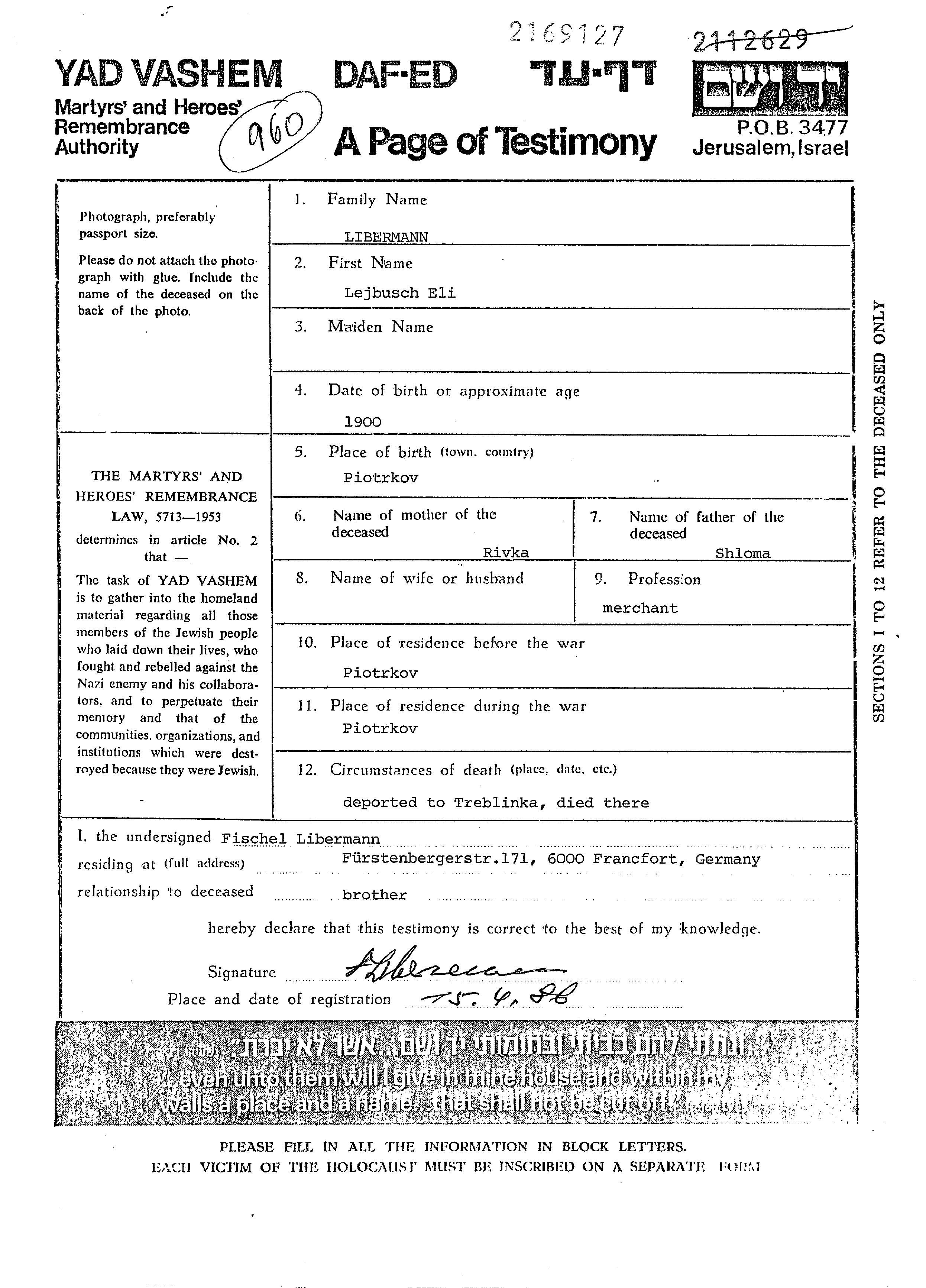Либерманн Эли Лейбуш 1900 Пётркув, Польша Лист свидетельских показаний