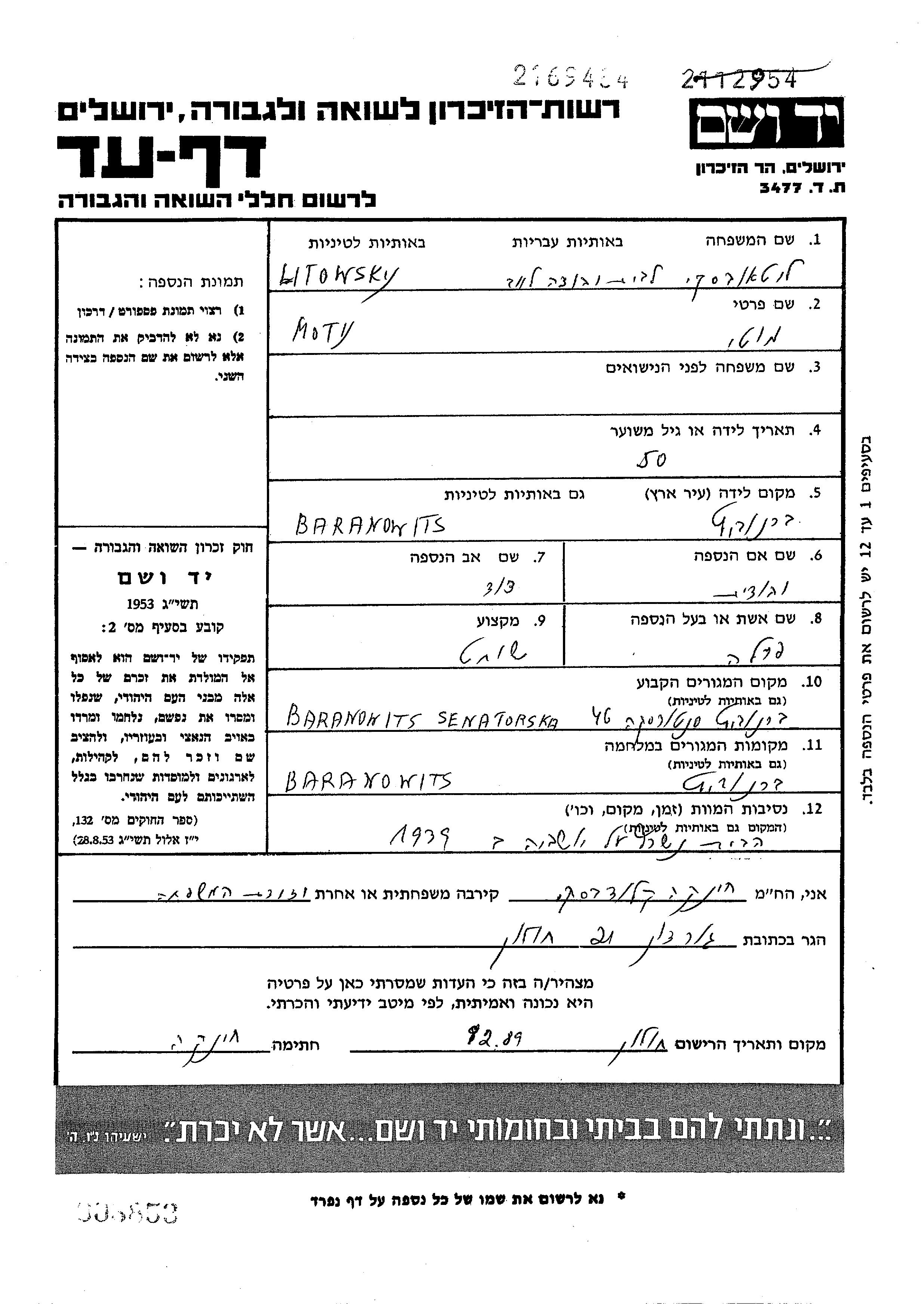 Моти Литовский, место рождения: Барановичи, Польша. Отец: Давид, mать:Иегудит. Резник. Женат / замужем. Место жительства до войны: Барановичи, Польша. Место во время войны: Барановичи, Польша.