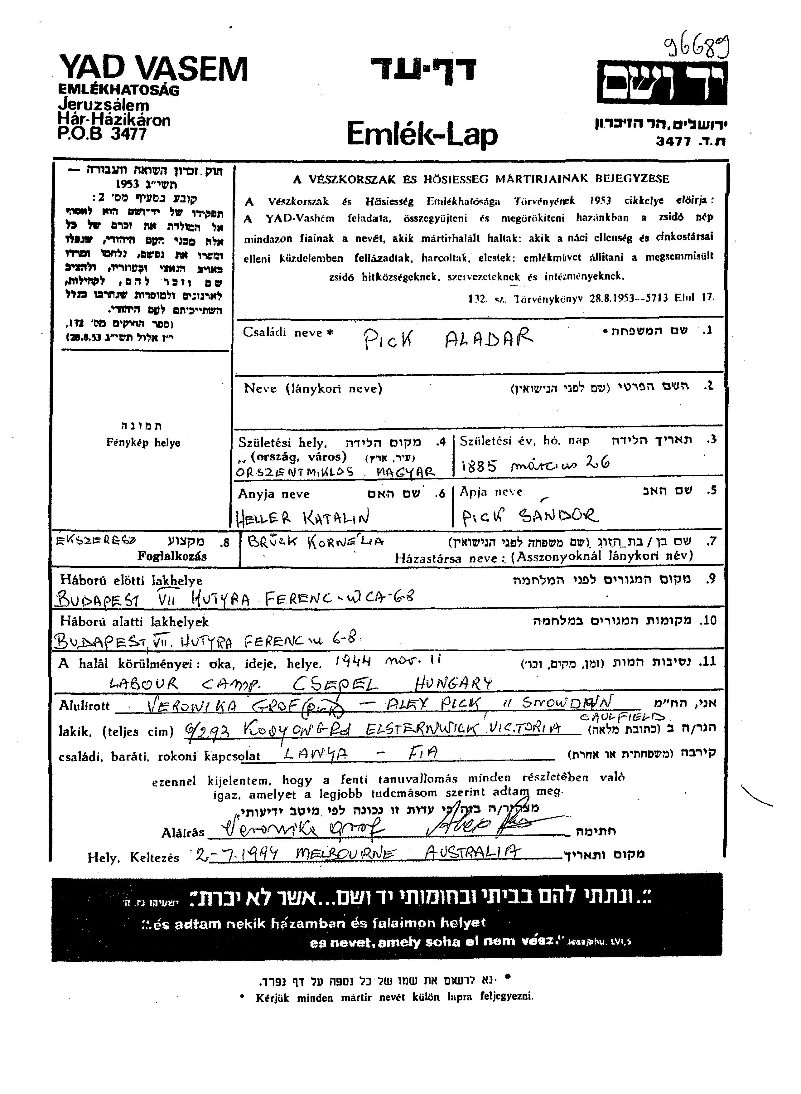 Аладар Пик, место рождения: Будапешт, Венгрия. Отец: Шандор, mать:Каталин, девичья фамилия Хойер. Ювелир. Женат / замужем. Место жительства до войны: Будапешт, Венгрия. Место во время войны: Будапешт, Венгрия.