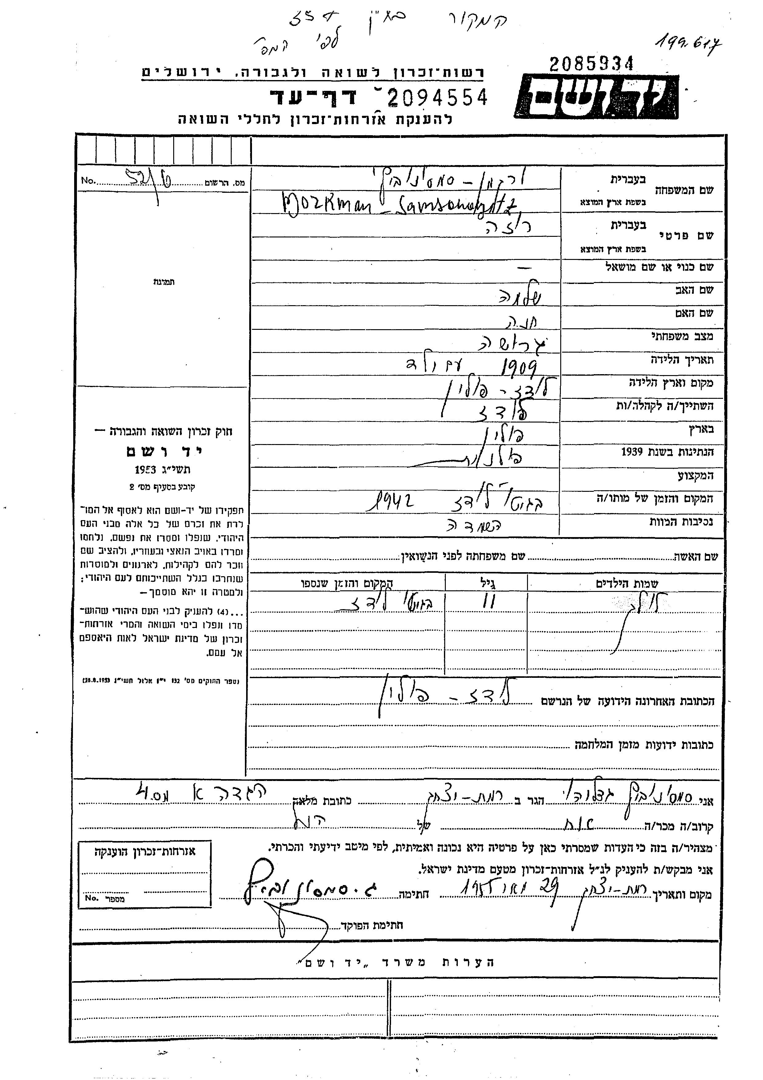 Яд Вашем - Листы свидетельских показаний Мемориального фонда
