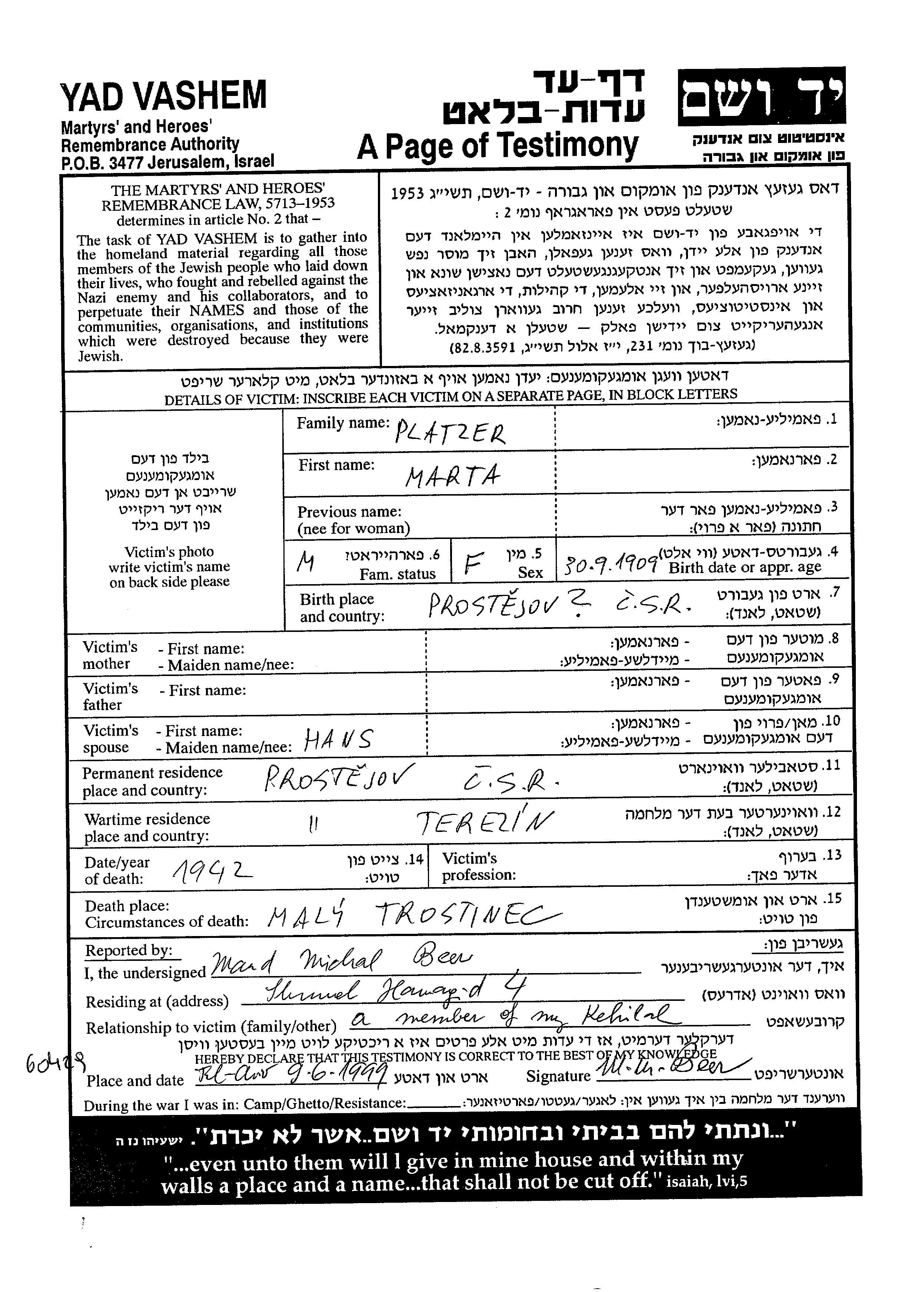 Марта Плацер, место рождения: Простеёв, Чехословакия. Женат / замужем. Место жительства до войны: Простеёв, Чехословакия. Место во время войны: Терезиенштадт, Чехословакия.