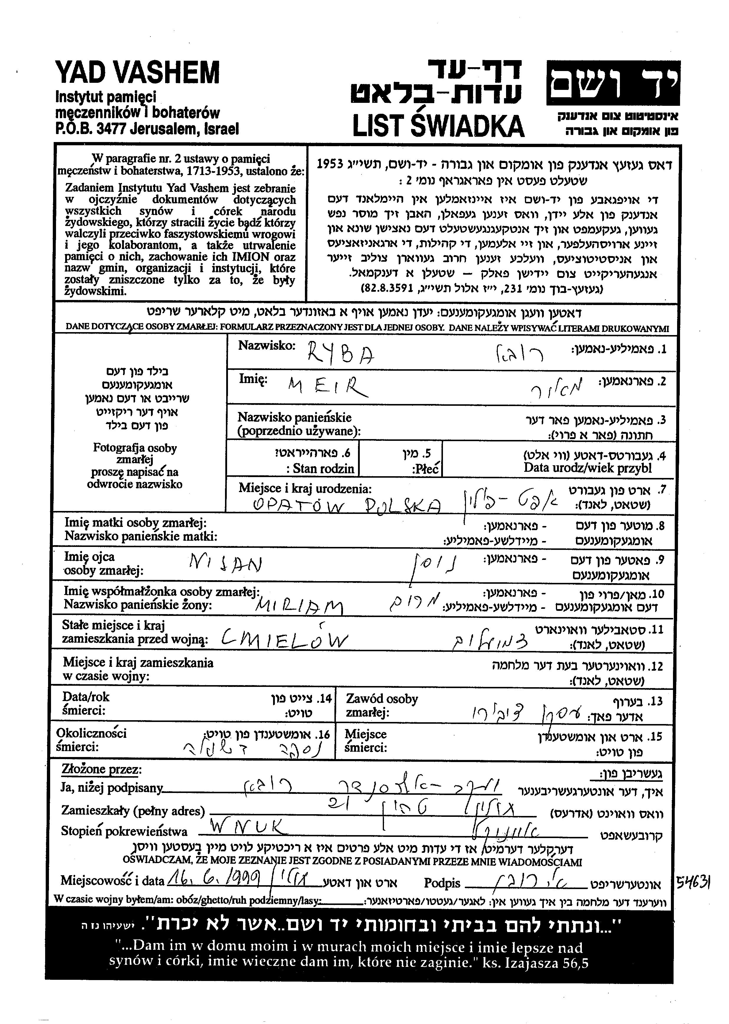 Меир Риба, место рождения: Опатув, Польша. Отец: Нисан. Общественный деятель. Место жительства до войны: Цмелув, Польша.