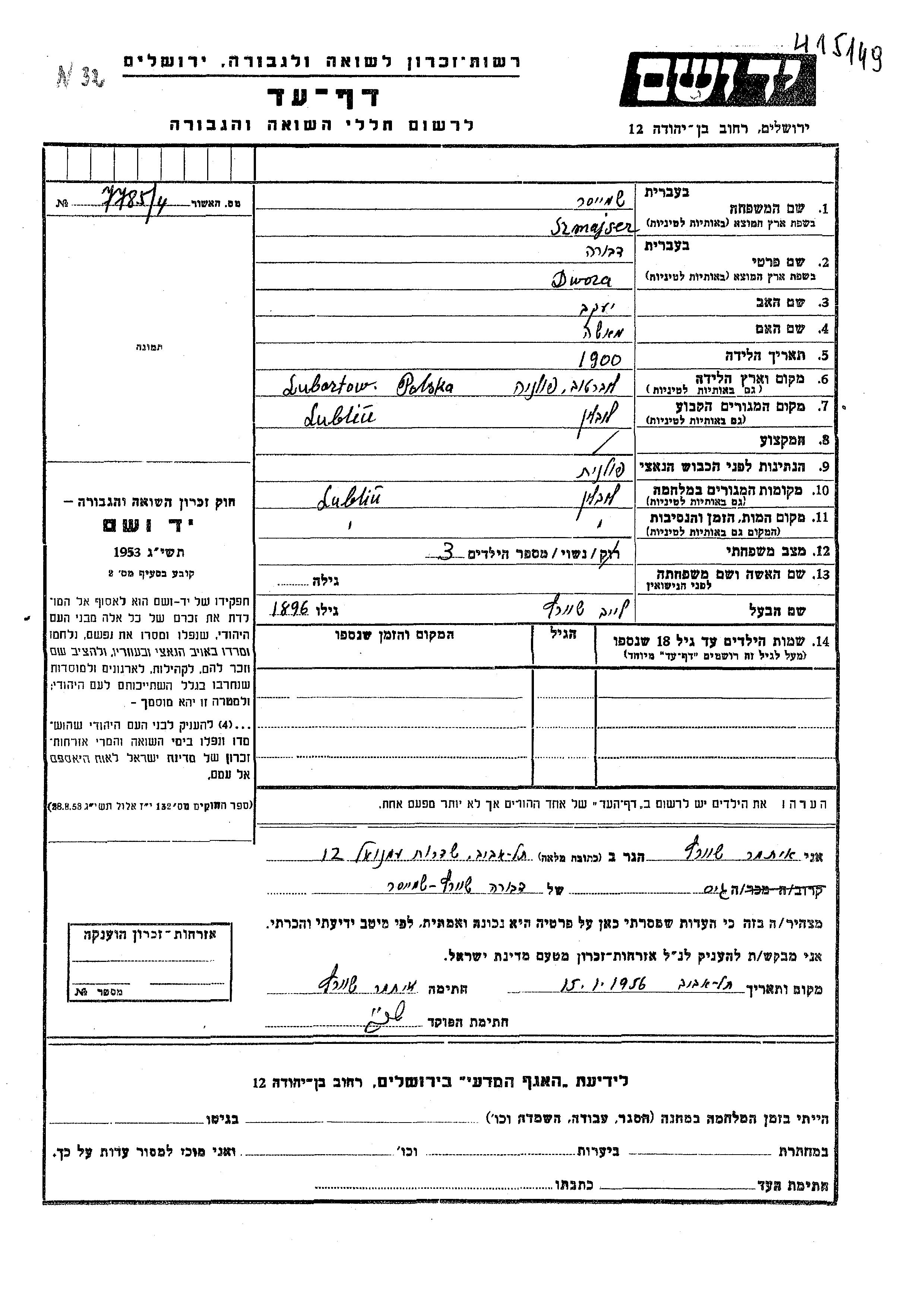 Двора Шмайсер, девичья фамилия Шварц, место рождения: Любартув, Польша. Отец: Яков, mать:Маша. Женат / замужем. Место жительства до войны: Люблин, Польша. Место во время войны: Люблин, Польша.