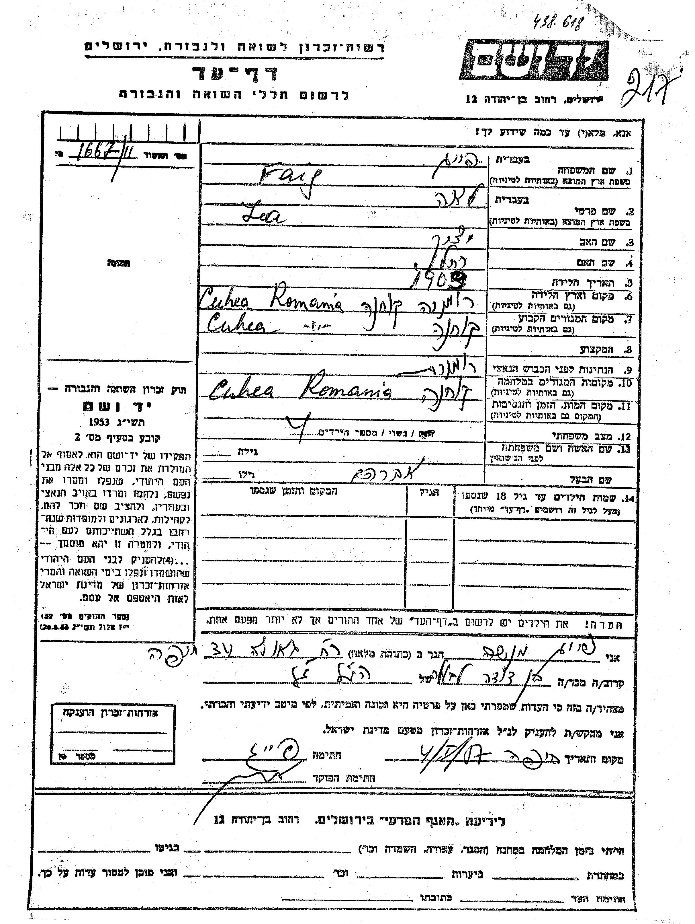 Файг Лея 1903 Кухя, Румыния Лист свидетельских показаний