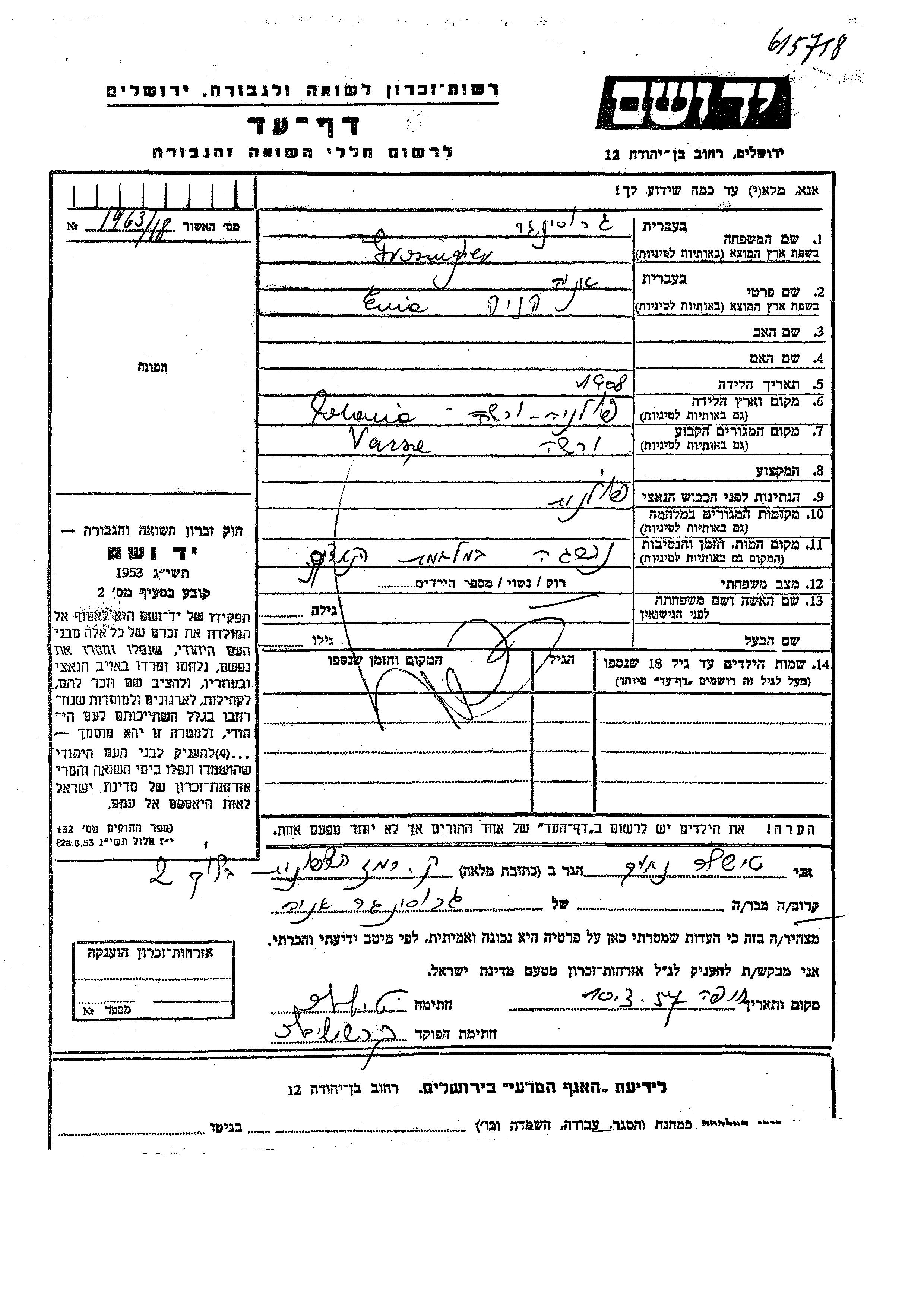 Гросингер Эне Хеня 1908 Варшава, Польша Лист свидетельских показаний