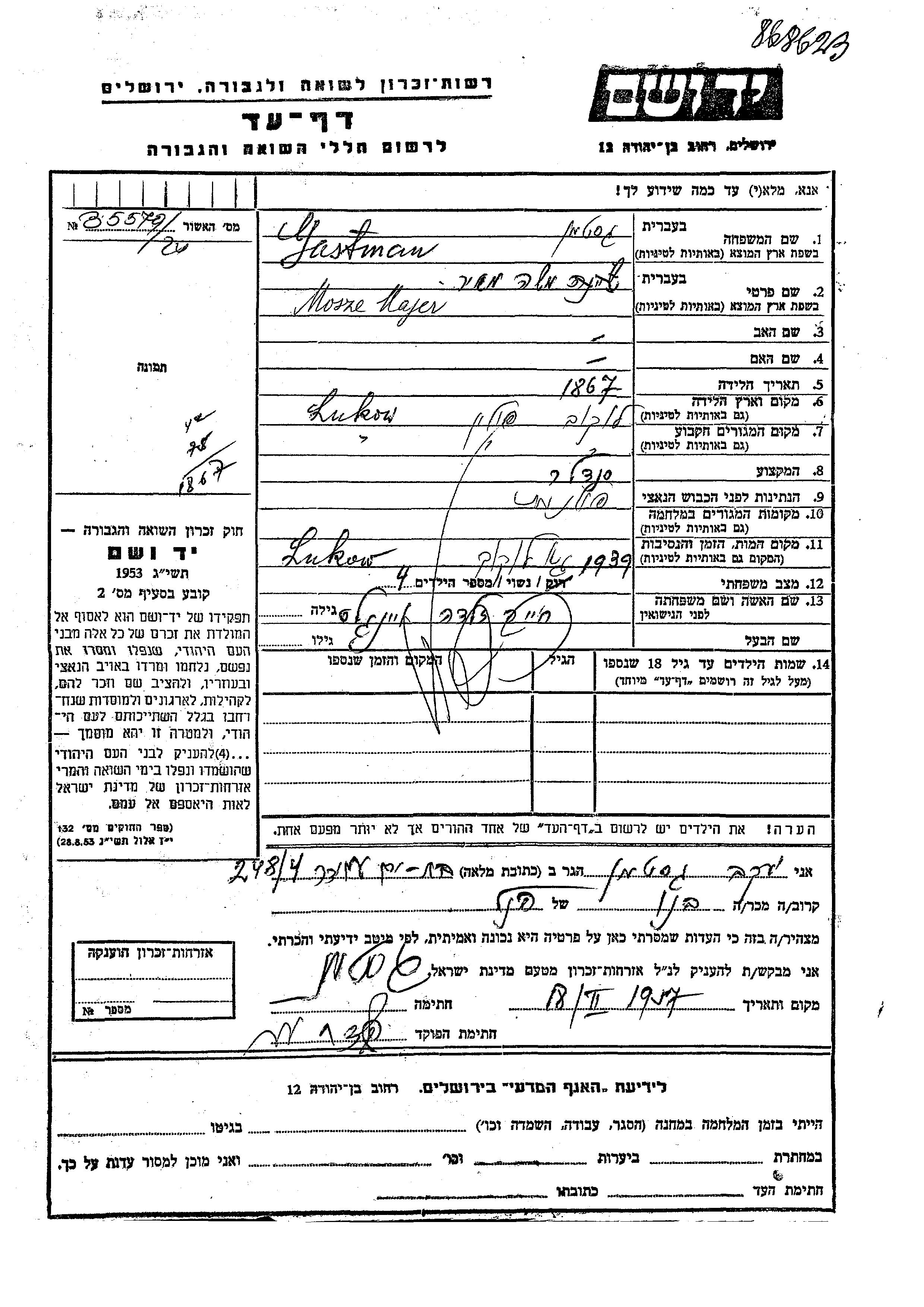 Моше Маер Гастман, место рождения: Лукув, Польша. Сапожник. Женат / замужем. Место жительства до войны: Лукув, Польша.