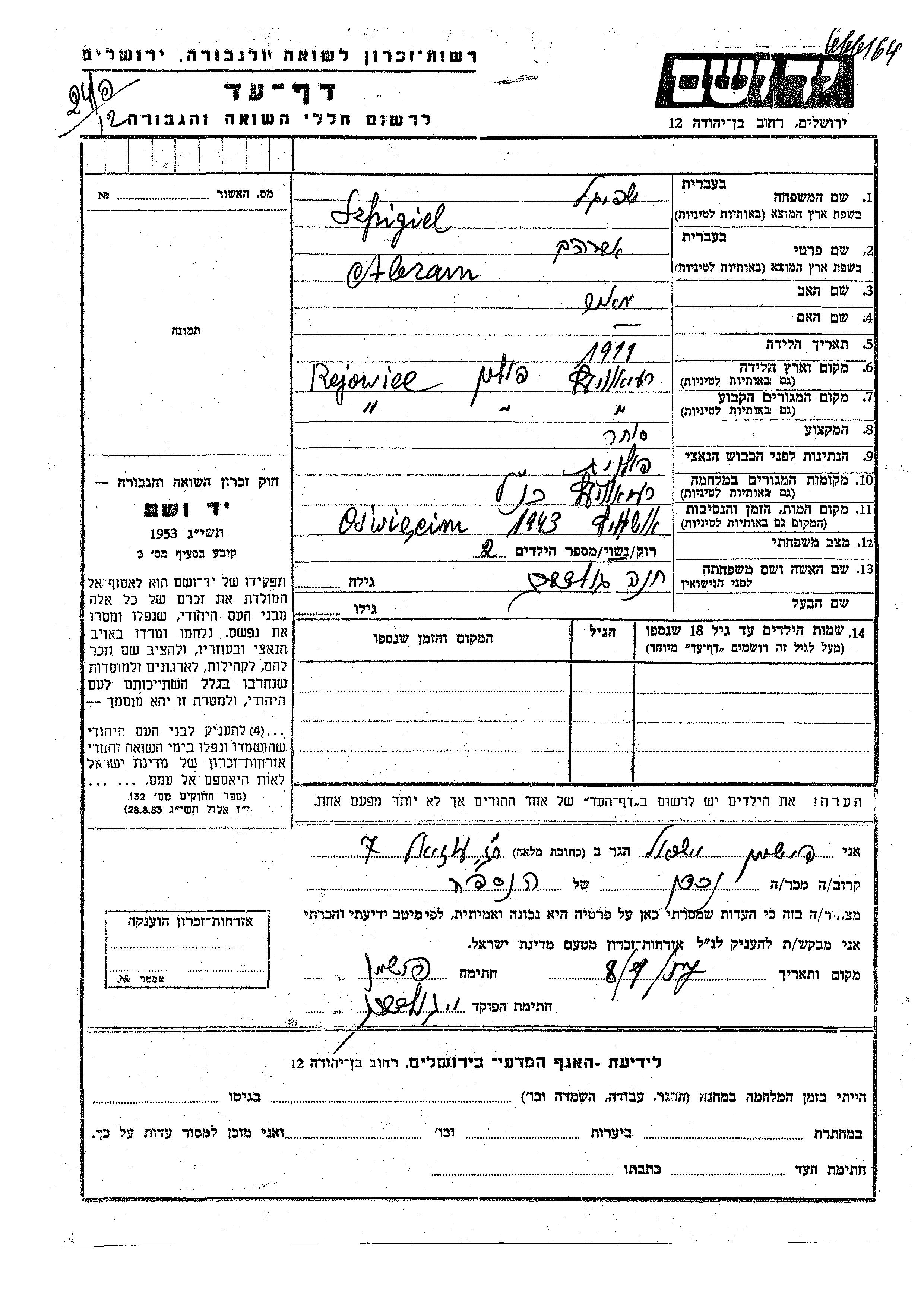 Шпигель Абрам 1911 Реёвец, Польша Лист свидетельских показаний