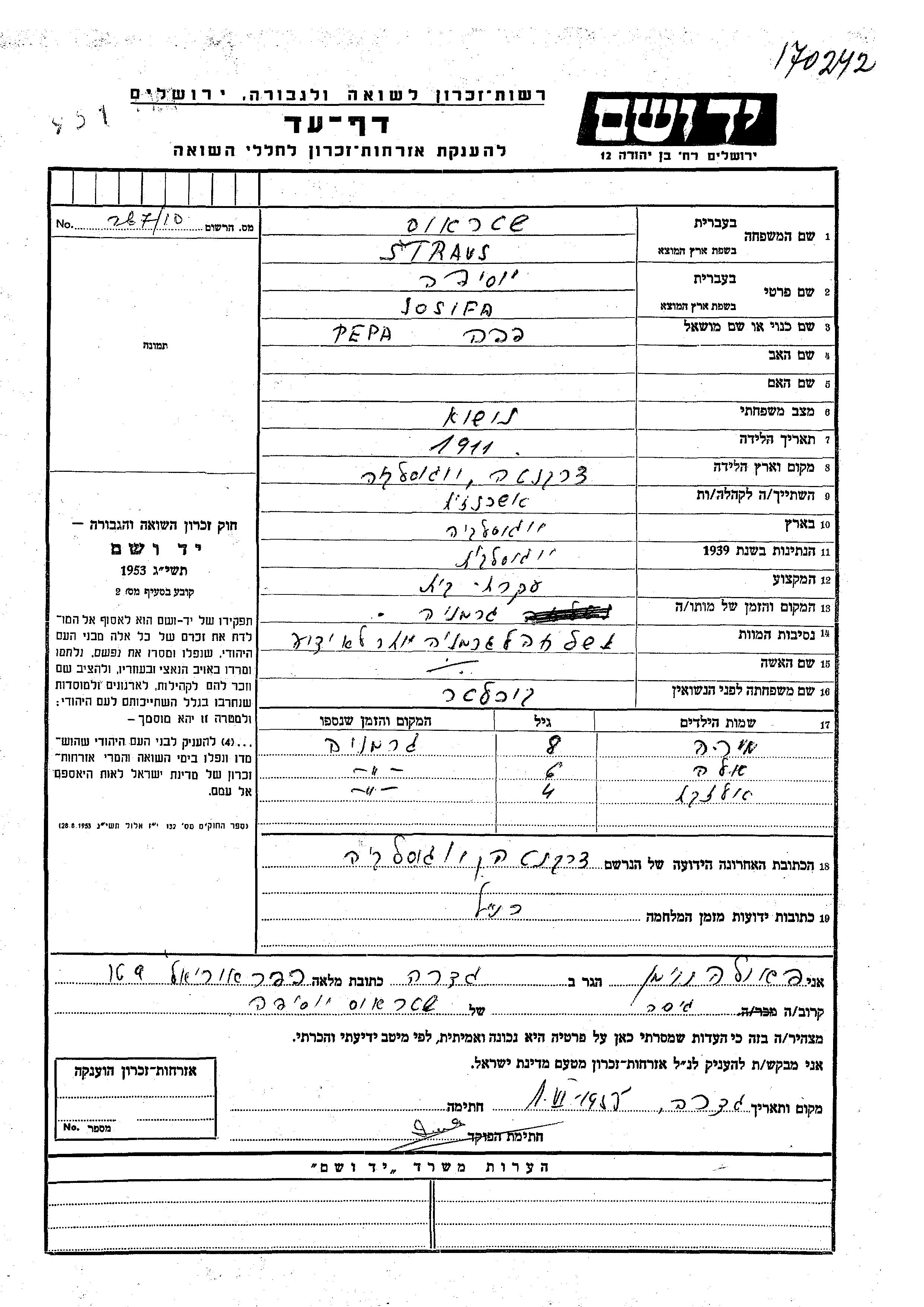 Йосифа Штраус, девичья фамилия Буххалтер, место рождения: Дервента, Югославия. Домохозяйка. Женат / замужем. Место жительства до войны: Дервента, Югославия. Место во время войны: Дервента, Югославия.