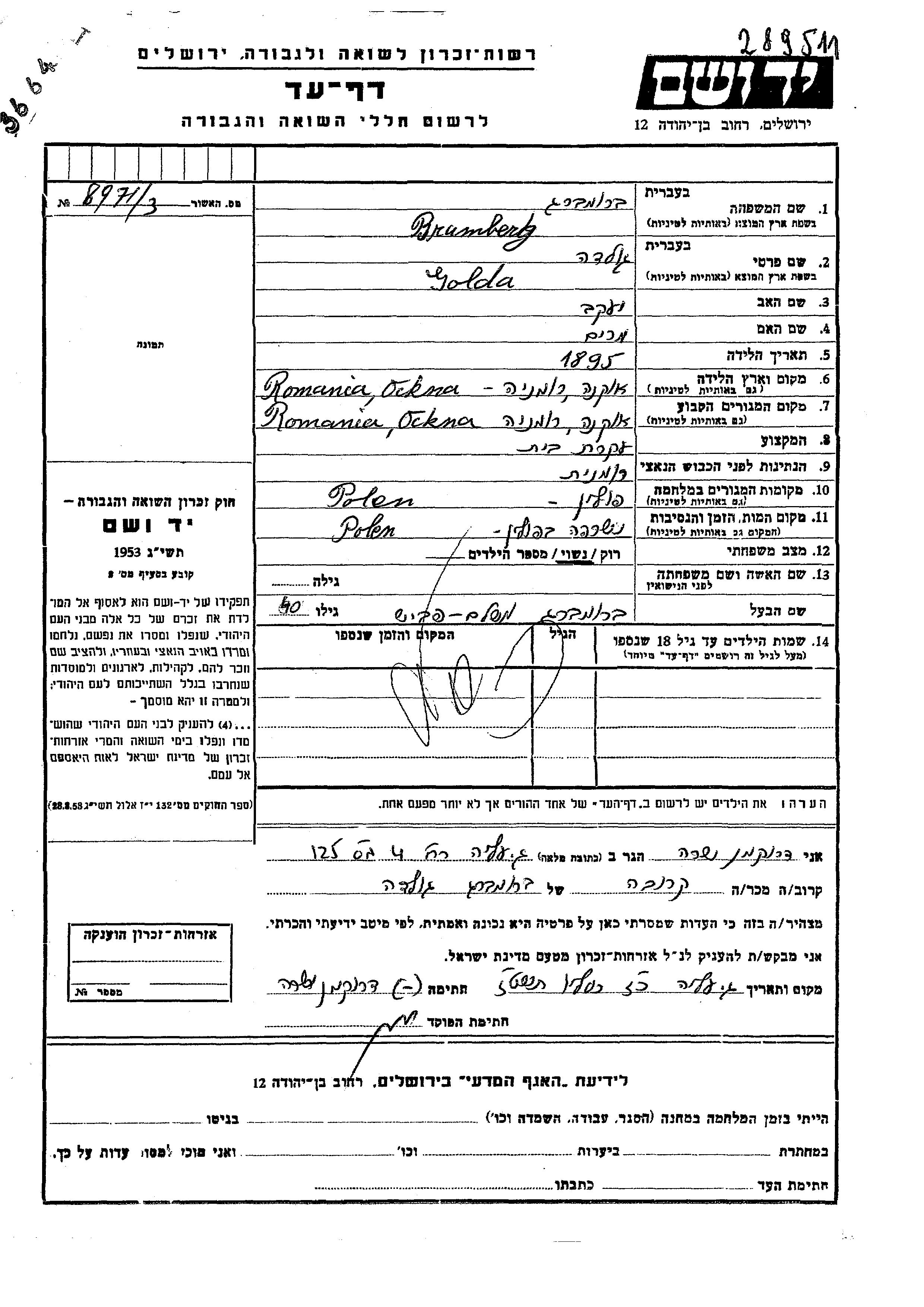 Голда Брумберг, место рождения: Okna, Румыния. Отец: Яков, mать:Мирьям. Домохозяйка. Женат / замужем. Место жительства до войны: Okna, Румыния. Место во время войны: Польша.