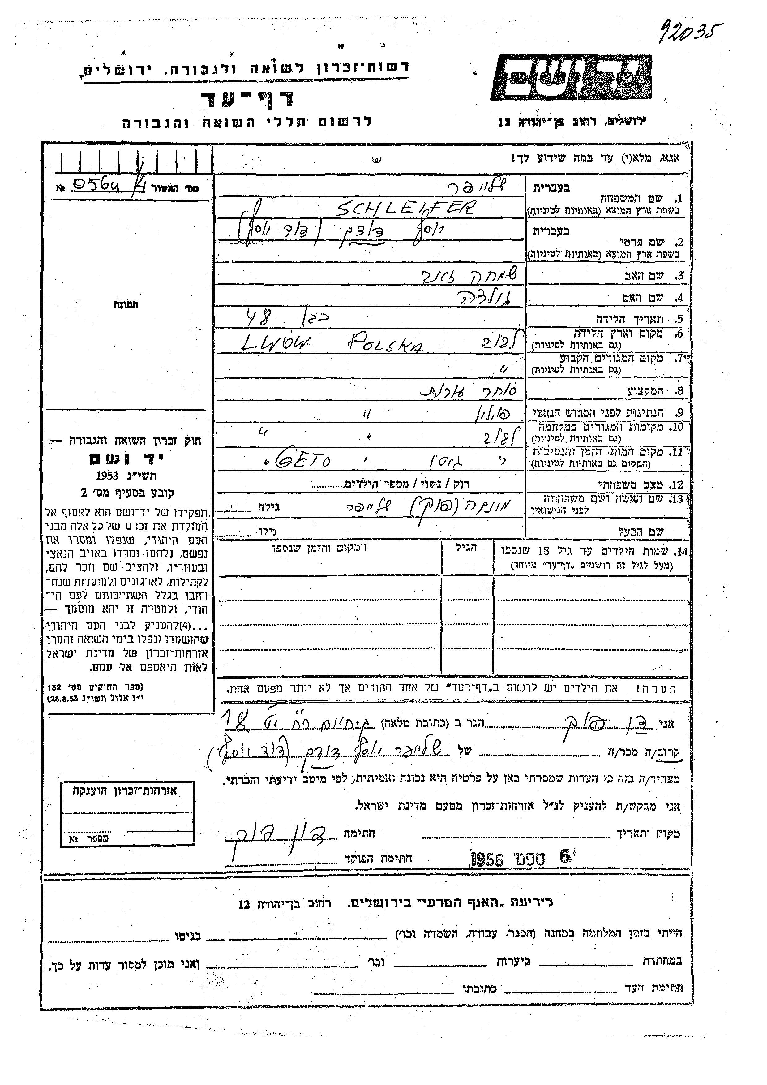 Шлайфер Лейфер Иосеф Давид Львов, Польша Лист свидетельских показаний