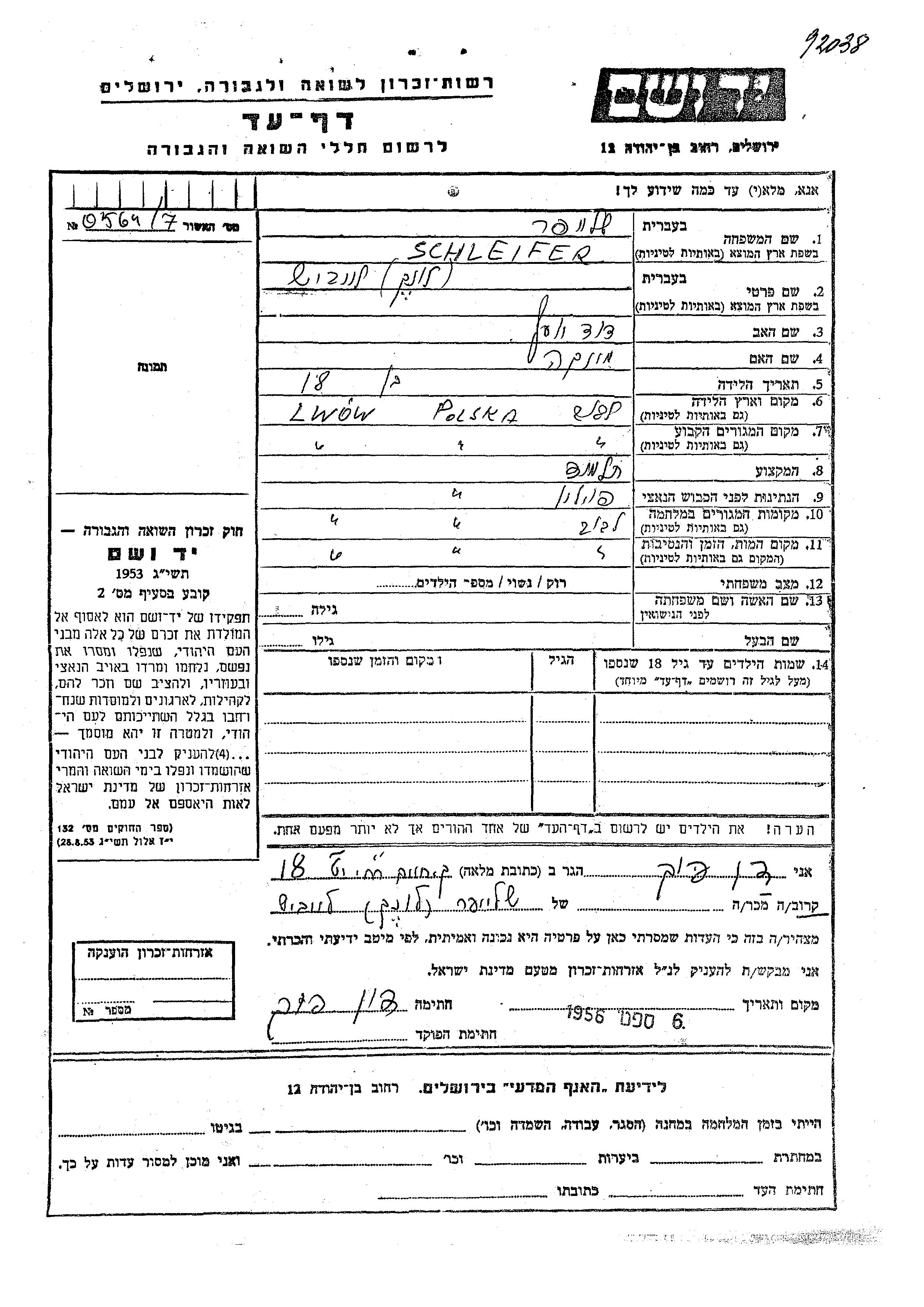 Лейбиш Лонек Шлайфер, место рождения: Львов, Польша. Отец: Давид Иосеф, mать:Минка. Ученик / ученица. Место жительства до войны: Львов, Польша. Место во время войны: Львов, Польша.