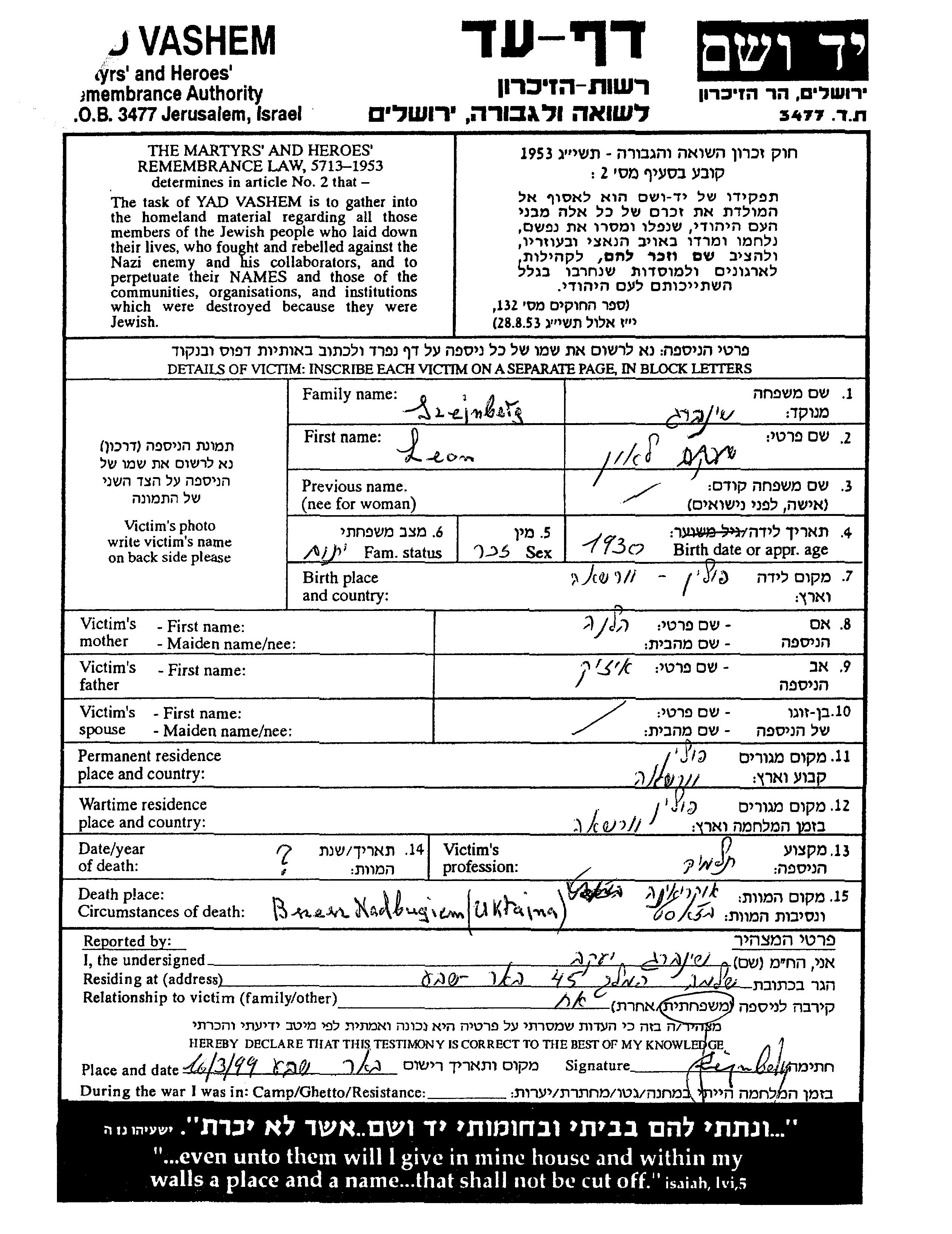 Яд Вашем - Листы свидетельских показаний Мемориального фонда