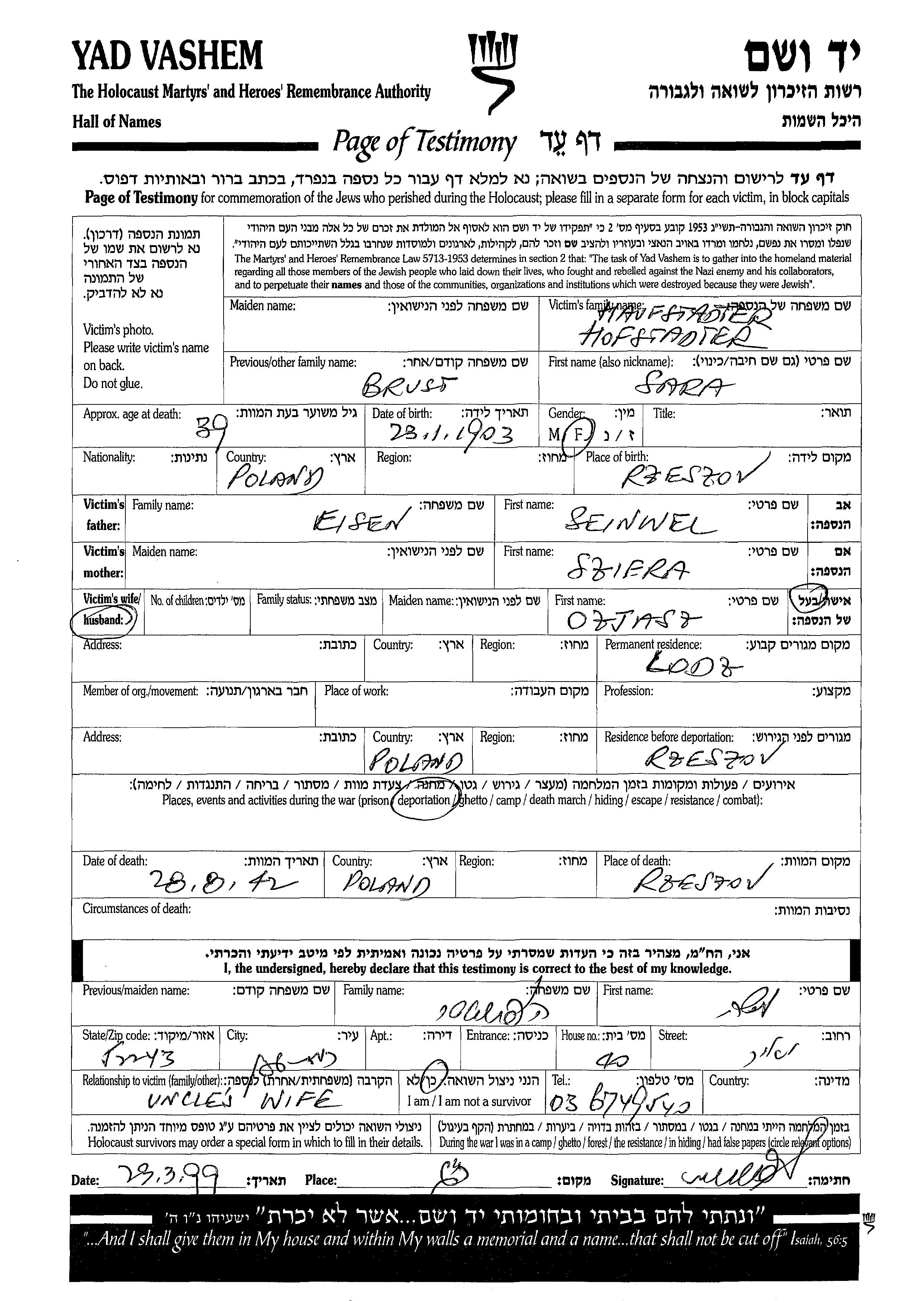 Сара Хофштадтер, девичья фамилия Бруст, место рождения: Жешув, Польша. Отец: Зейнвиль, mать:Сара. Женат / замужем. Место жительства до войны: Лодзь, Польша. Место во время войны: Жешув, Польша.