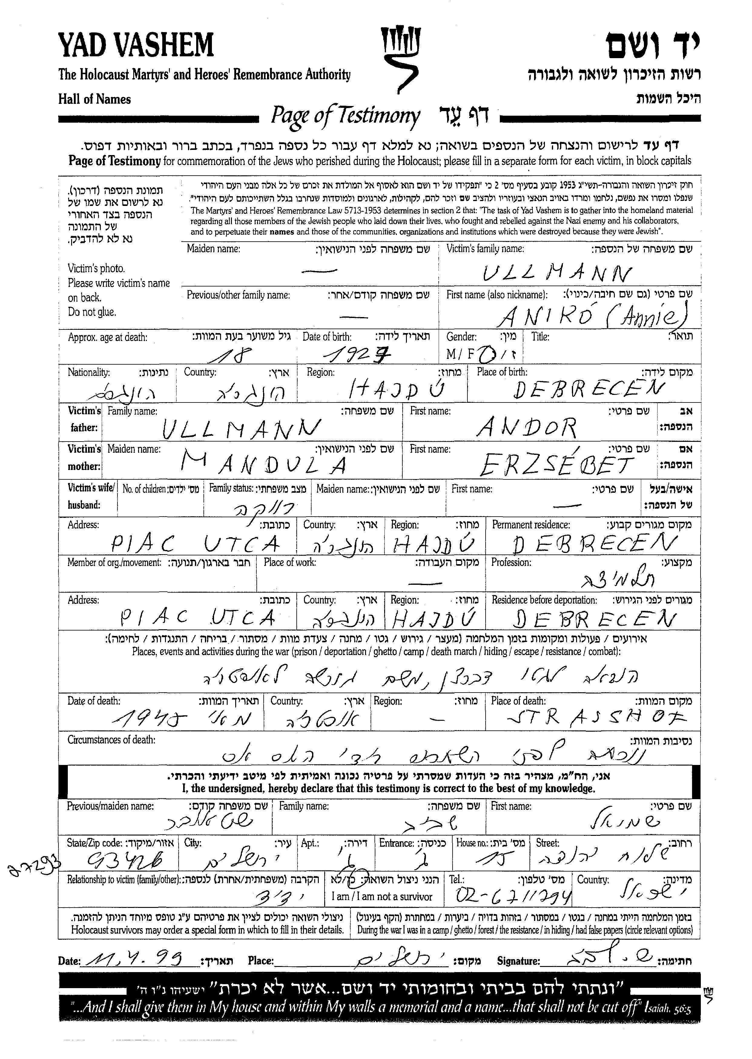 Анни Ульманн, место рождения: Дебрецен, Венгрия. Отец: Андор, mать:Эржебет, девичья фамилия Мандула. Ученик / ученица. Холост / не замужем. Место жительства до войны: Дебрецен, Венгрия. Место во время войны: Дебрецен, Венгрия.