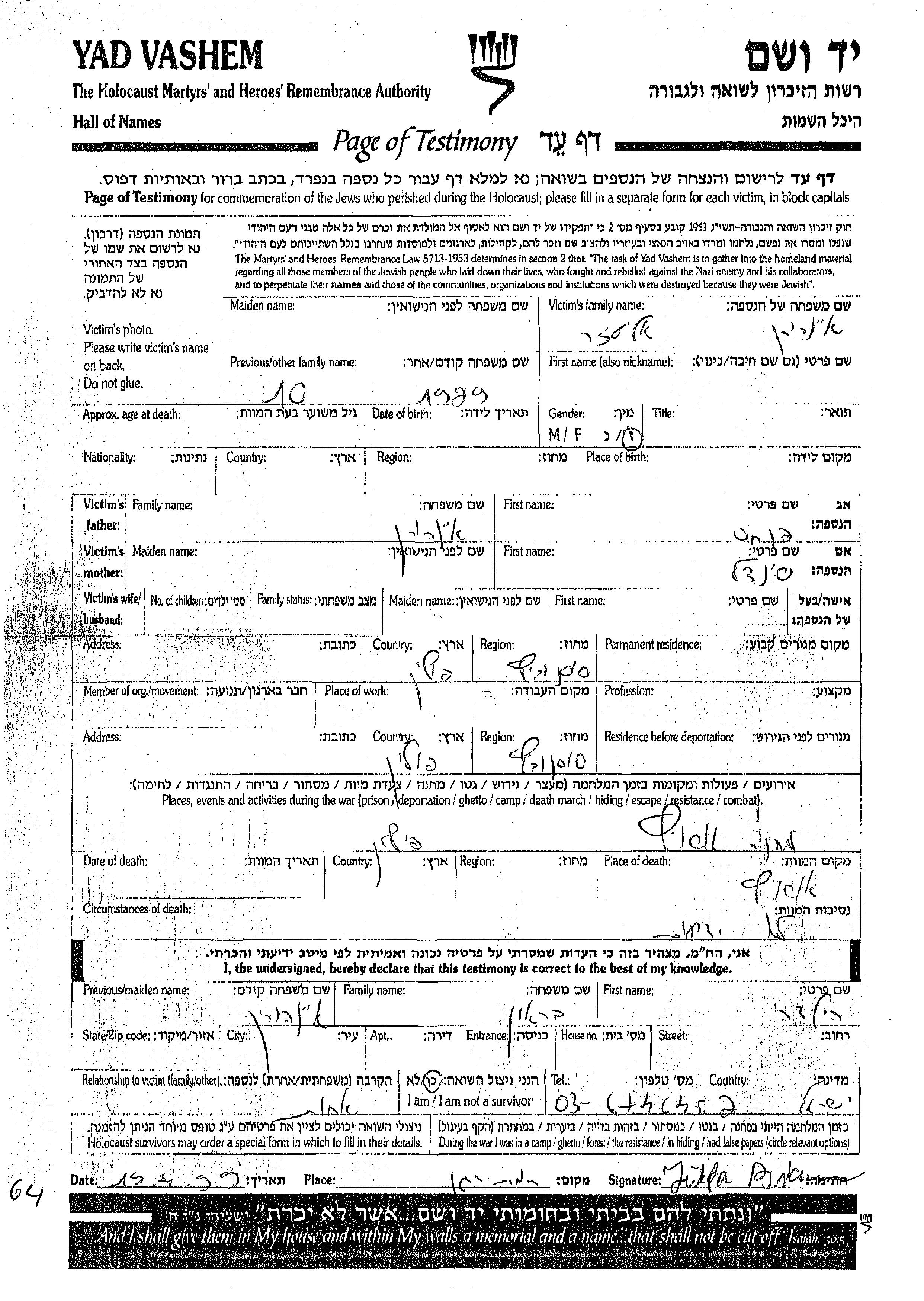 Яд Вашем - Листы свидетельских показаний Мемориального фонда